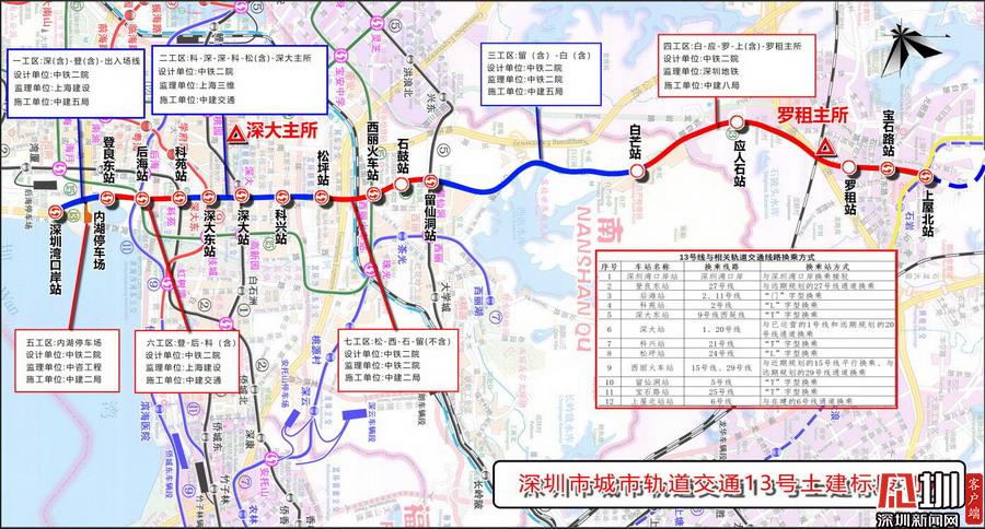 據(jù)了解,地鐵13號線由南至北穿過南山區(qū)、寶安區(qū)和光明新區(qū)。項(xiàng)目共設(shè)車站16座,線路總長22.436公里,出入線與后海站接軌,將穿越已運(yùn)營的地鐵1號線、2號線、5號線、11號線。由于沿途工程地質(zhì)條件復(fù)雜、換乘站多、工程實(shí)施難度大、長區(qū)間盾構(gòu)、拆遷工作繁重、交通疏解復(fù)雜等原因,13號線被稱為深圳地鐵建設(shè)史上最難的地鐵線路之一。