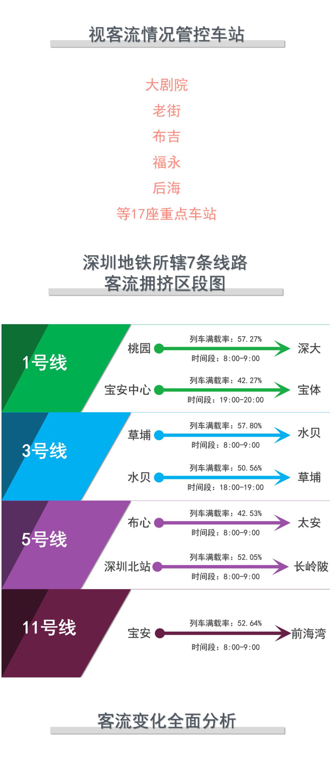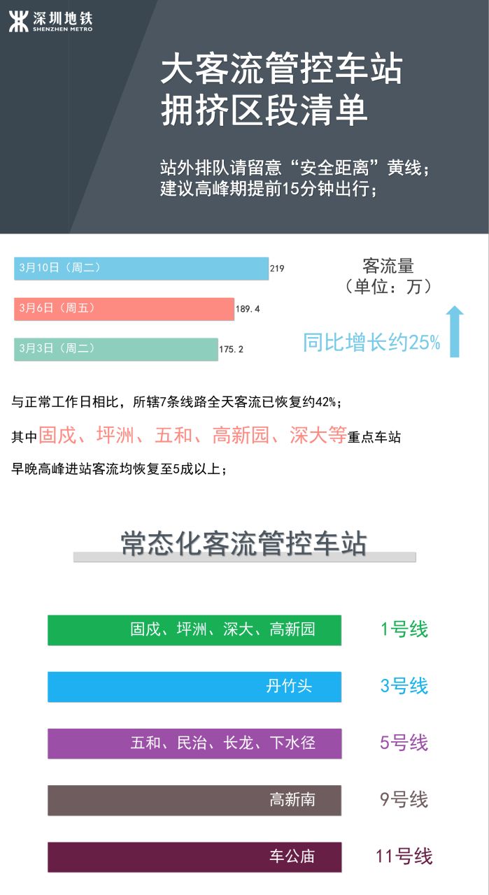 3月10日(周二),深圳地鐵所轄7條線路客流量已達(dá)219萬(wàn)人次,為防止客流激增而造成乘客過(guò)度擁擠,深圳地鐵已在11座大客流站點(diǎn),實(shí)行常態(tài)化客流管控。另外有17座重點(diǎn)車站,也將視客流情況隨時(shí)采取客流管控措施。