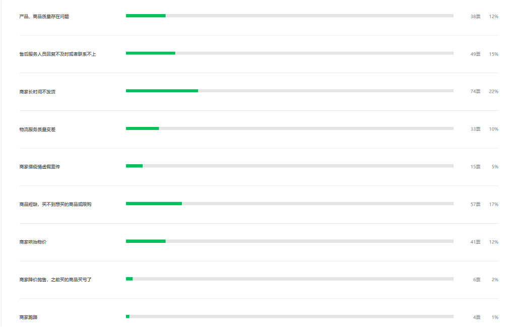 不少市民表示,疫情期間“在線消費(fèi)”遇到過問題。其中,長時間不發(fā)貨、因商品短缺或限購買不到商品、售后服務(wù)人員回復(fù)不及時或聯(lián)系不上位列市民消費(fèi)不滿意榜前三;而商品質(zhì)量存在問題、商家哄抬物價(jià)則并列消費(fèi)不滿意榜第四。