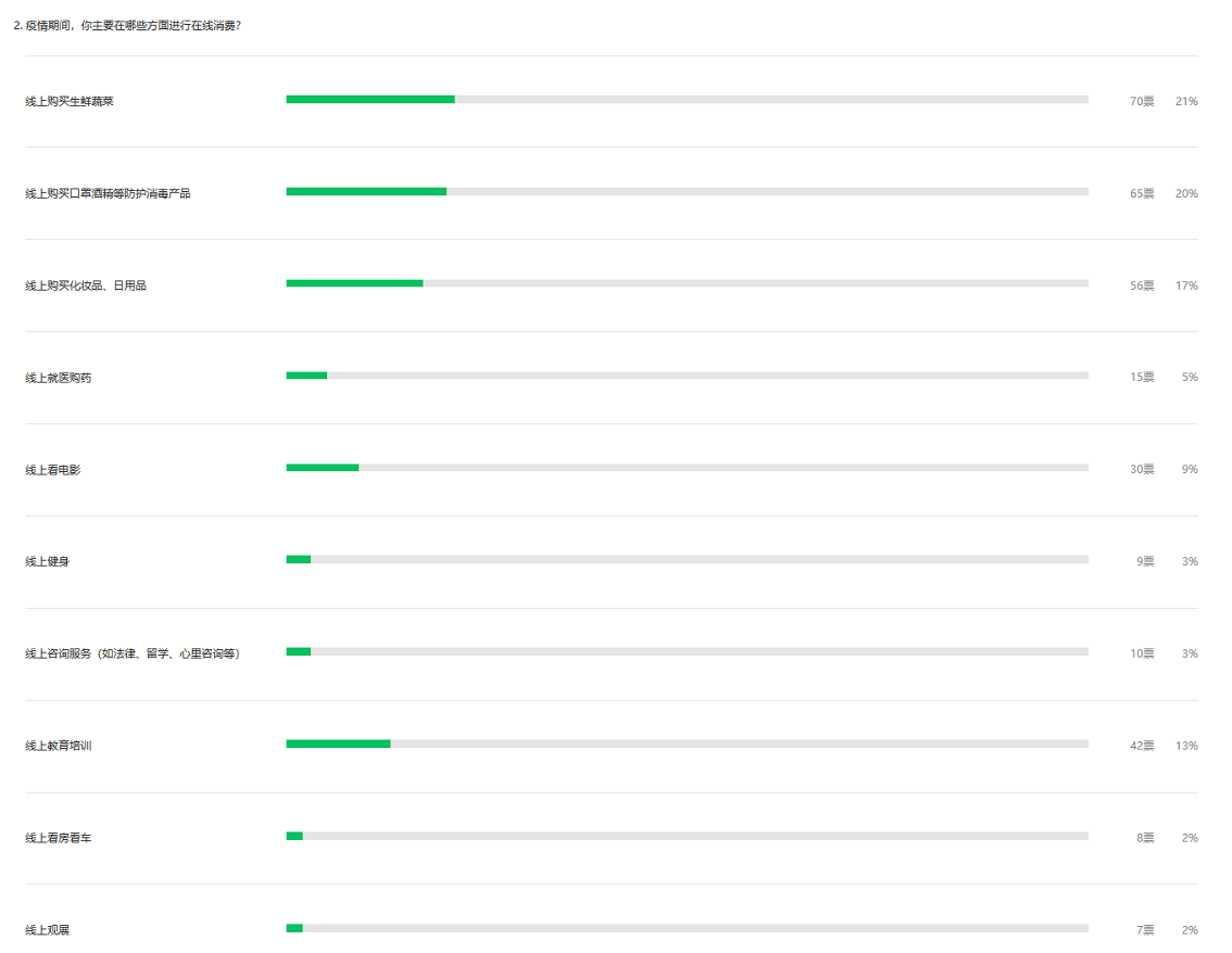 雖然有56%的市民表示對“在線消費(fèi)”的商品質(zhì)量和服務(wù)評價(jià)滿意度下降,但是市民的原有生活習(xí)慣卻在潛移默化中改變了,超一半的市民表示喜歡“在線消費(fèi)”,疫情結(jié)束后,會提高“在線消費(fèi)”在日常開銷中的比例。特別是會加強(qiáng)生鮮蔬菜、口罩酒精、化妝日用品的購買頻率,也會更常使用網(wǎng)絡(luò)進(jìn)行教育培訓(xùn)、就醫(yī)購藥、法律咨詢、看房看車等。