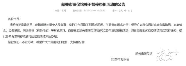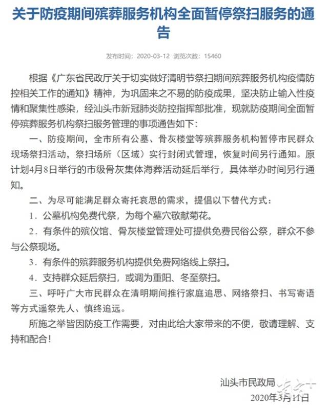 據(jù)統(tǒng)計,截至3月15日17時,深圳、汕頭、中山等地發(fā)文明確,全市暫停祭掃服務,倡導通過家庭追思、網絡祭掃、書寫寄語等方式遙祭先人、慎終追遠。此外,韶關市殯儀館暫停2020年清明祭祀活動。