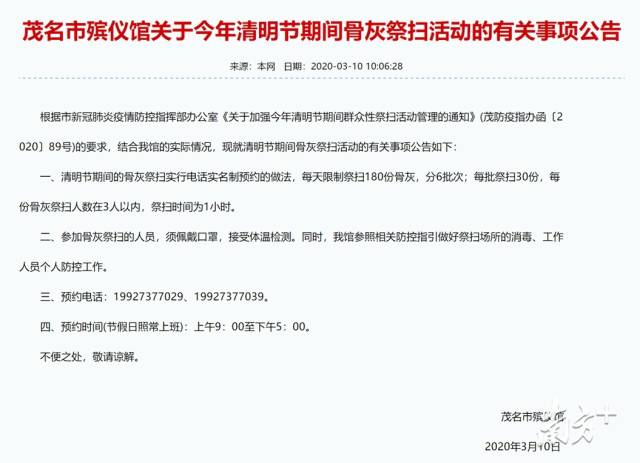 茂名市殯儀館提供限制性祭掃服務,清明節(jié)期間的骨灰祭掃實行電話實名制預約,每天限制祭掃180份骨灰,分6批次;每批祭掃30份,每份骨灰祭掃人數(shù)在3人以內,祭掃時間為1小時。