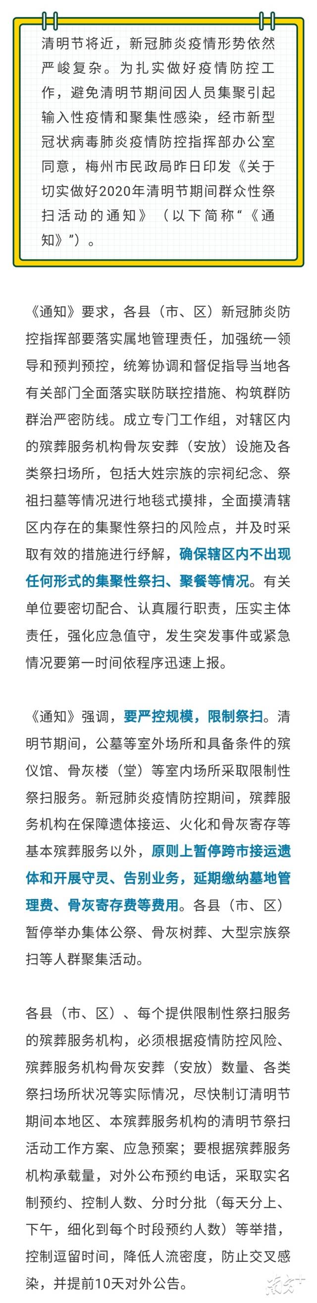 根據(jù)要求,廣東暫停舉辦集體公祭、骨灰海葬、骨灰樹葬等人群聚集活動。各地級以上市新冠肺炎防控指揮部要盡快研究決定清明節(jié)期間本地區(qū)殯葬服務機構暫?;蛘呦拗萍罀叻?,并對外公告。疫情防控風險較高的,暫停祭掃服務;具備條件且防控措施落實到位的,可提供限制性祭掃服務。