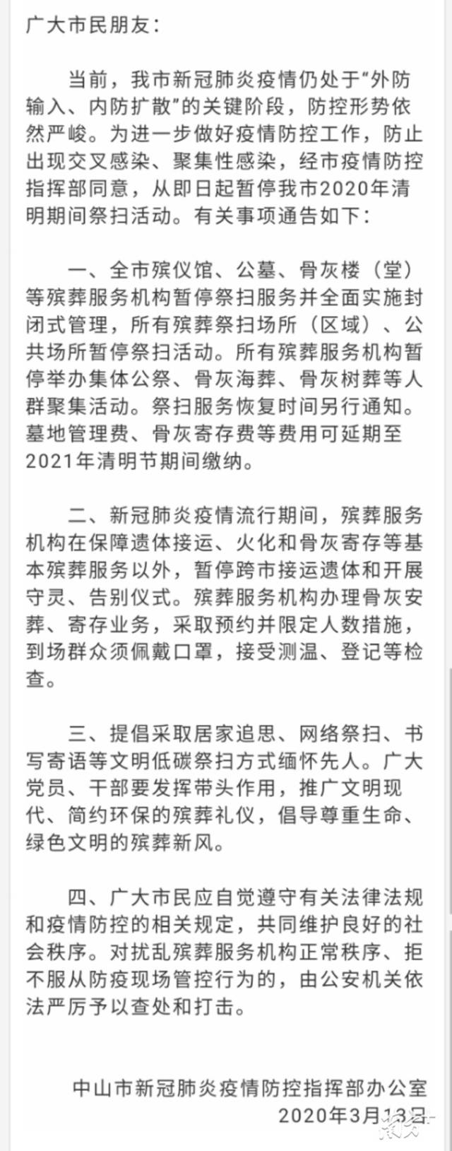 中山全市所有殯葬祭掃場所(區(qū)域)、公共場所暫停祭掃活動。殯葬服務機構辦理骨灰安葬、寄存業(yè)務,采取預約并限定人數(shù)措施。
