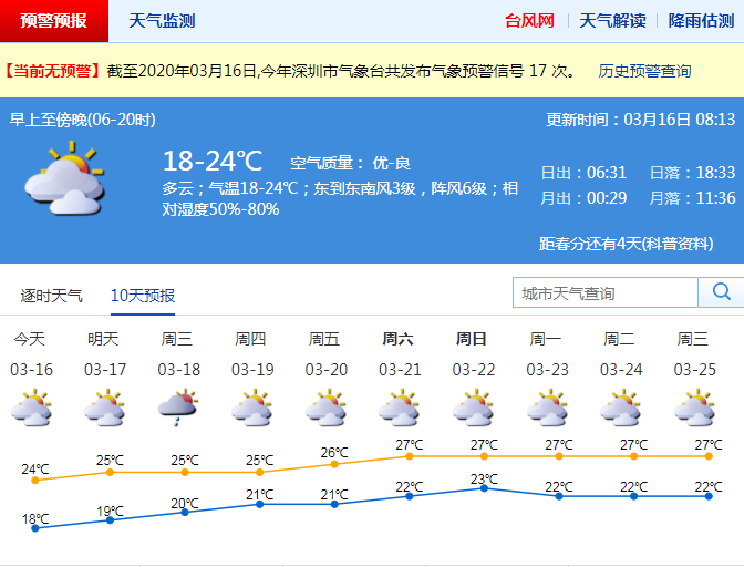 見圳客戶端·深圳新聞網(wǎng)2020年3月16日訊 剛剛過去的周末,鵬城天氣溫暖濕潤(rùn),以多云為主。早晨最低氣溫17℃-19℃,白天最高氣溫23℃-24℃。市氣象臺(tái)預(yù)測(cè),本周天氣溫暖濕潤(rùn),部分時(shí)間有陣雨。