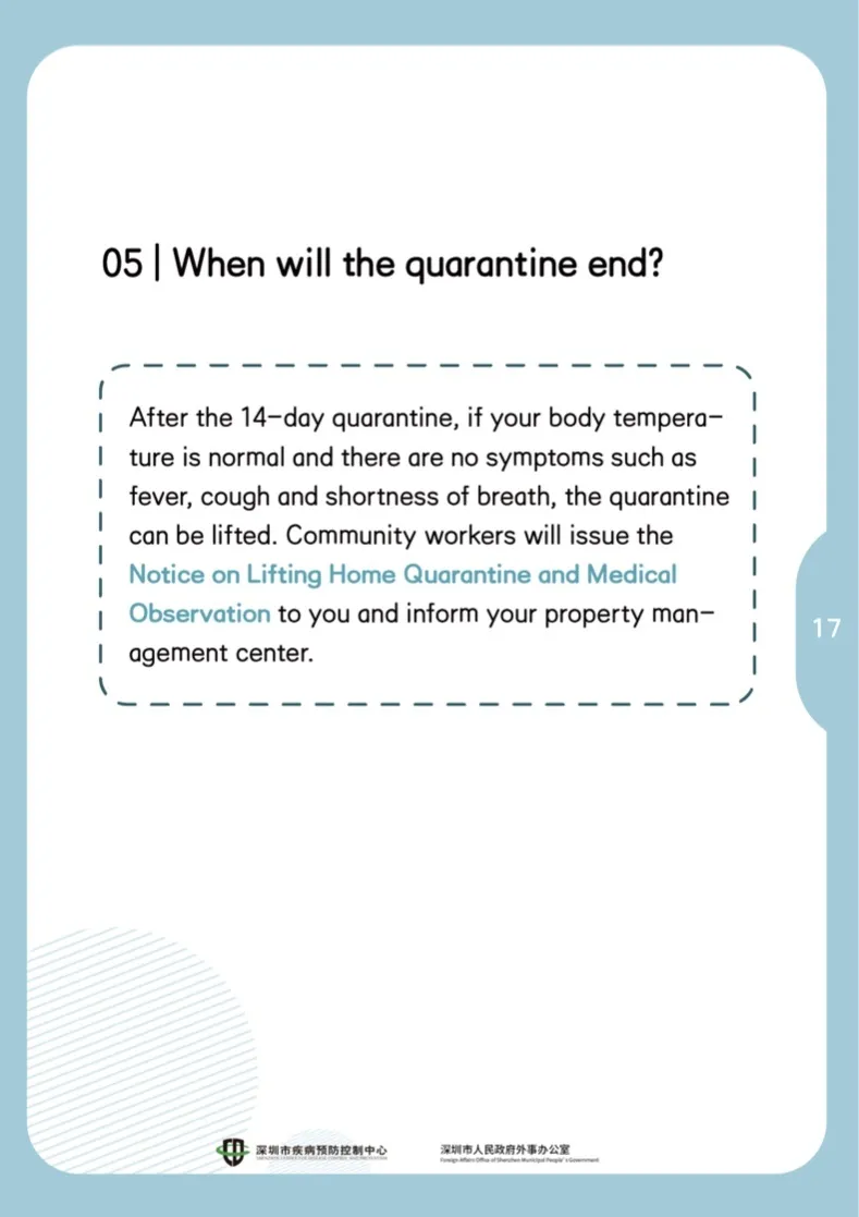 隔離滿14天后,如果體溫正常,無發(fā)熱、咳嗽、氣促這些癥狀,就可以解除隔離了。社區(qū)工作人員會發(fā)放《解除居家隔離醫(yī)學(xué)觀察告知書》,并通知物業(yè)。