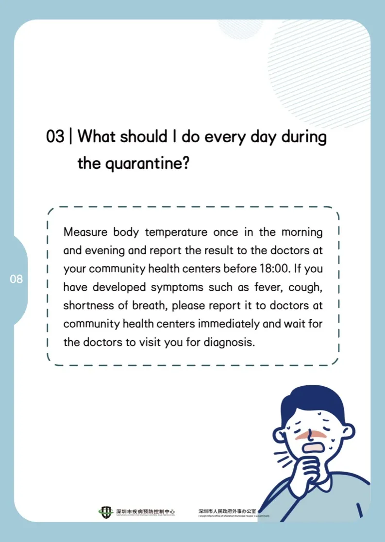 應(yīng)在早、晚各測量一次體溫,并于每天18∶00時(shí)前報(bào)告給社康醫(yī)生。如果出現(xiàn)有發(fā)熱、咳嗽、氣促等癥狀,應(yīng)立即向社康醫(yī)生報(bào)告,社康醫(yī)生會上門診斷。