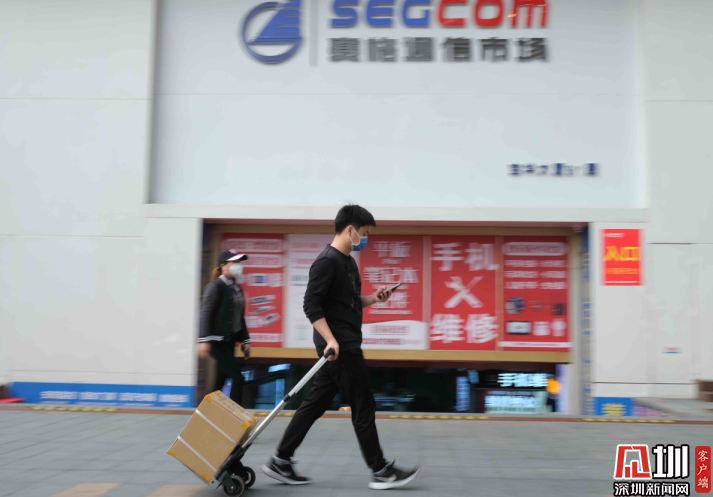 3月16日下午,賽格通訊市場門口,一名拉著小推車的人經(jīng)過。