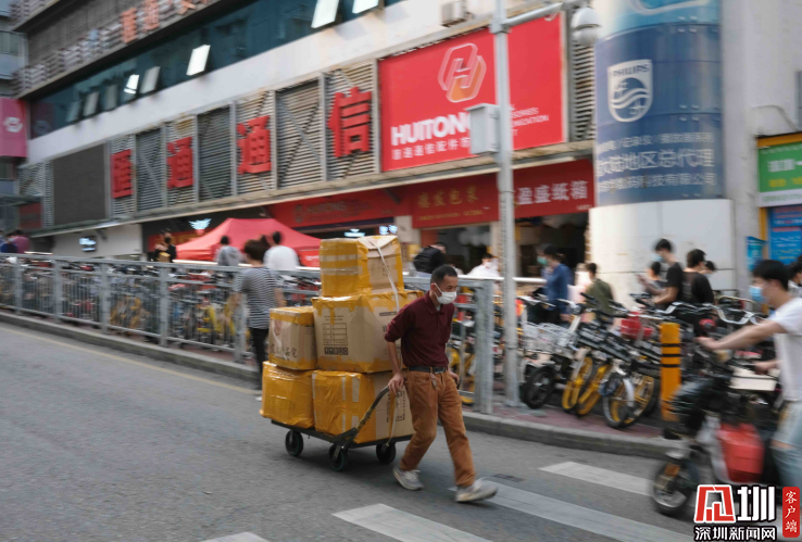 華強北商圈,一位正在運送貨物的人。