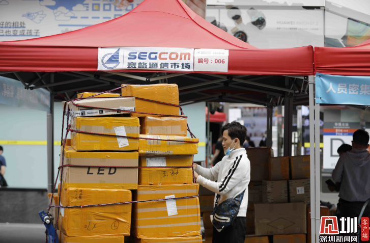 華強北步行街的臨時帳篷旁邊,一位從業(yè)者正在整理貨物。