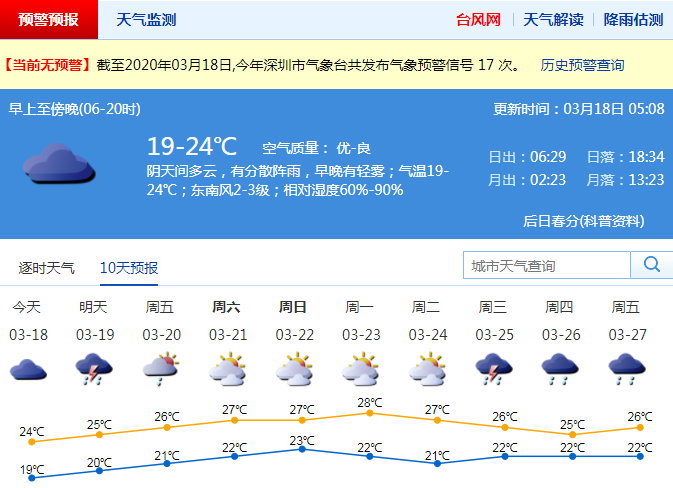 見圳客戶端·深圳新聞網(wǎng)2020年3月18日訊 送走前幾日干爽的天氣,我市將迎來新一波降雨。記者從市氣象局獲悉,受高空小波動和低層西南風(fēng)加大影響,預(yù)計(jì)18-19日我市有明顯降雨,其中18日陰天間多云,有分散陣雨,氣溫19-24℃;19日陰天有(雷)陣雨,部分時間雨勢稍大;20日陣雨轉(zhuǎn)多云,早晚有輕霧或霧;21-24日多云為主,天氣溫暖濕潤。