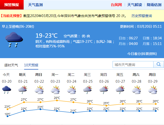 據(jù)深圳氣象臺預報,20日有雷陣雨,局部大雨,氣溫19-23℃;21日降雨結(jié)束。21-24日溫暖濕潤,早晚有輕霧或霧;25-26日有雷陣雨。