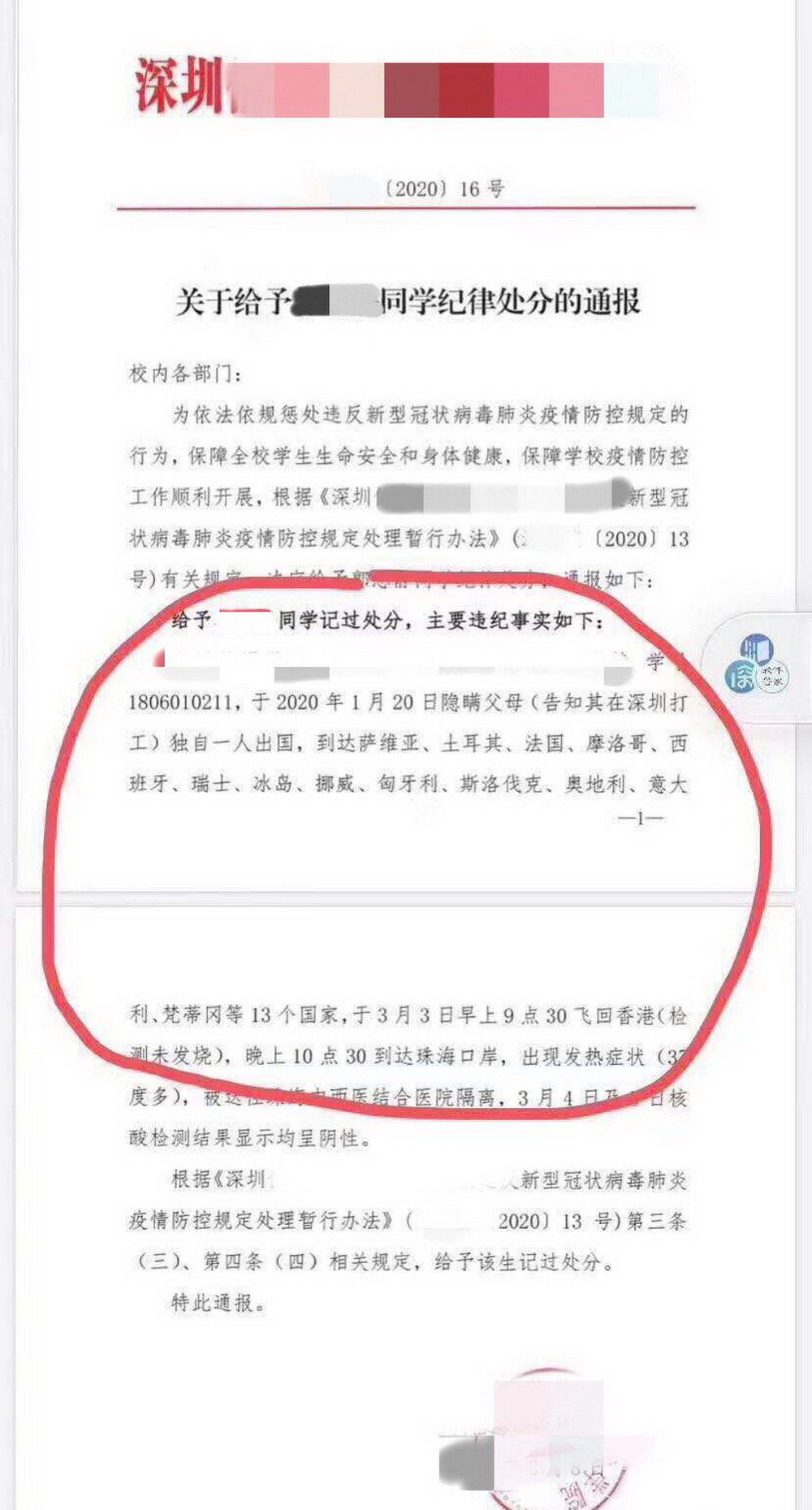 見圳客戶端·深圳新聞網(wǎng)2020年3月20日訊 近日,一位深圳女大學(xué)生小Y瞞著父母出游13國(guó),回國(guó)后因發(fā)熱被隔離并因未如實(shí)向?qū)W校匯報(bào)行程被處分,此事引發(fā)社會(huì)關(guān)注。3月18日,當(dāng)事人接受深圳新聞網(wǎng)記者采訪,詳述事件經(jīng)過并表達(dá)悔意。