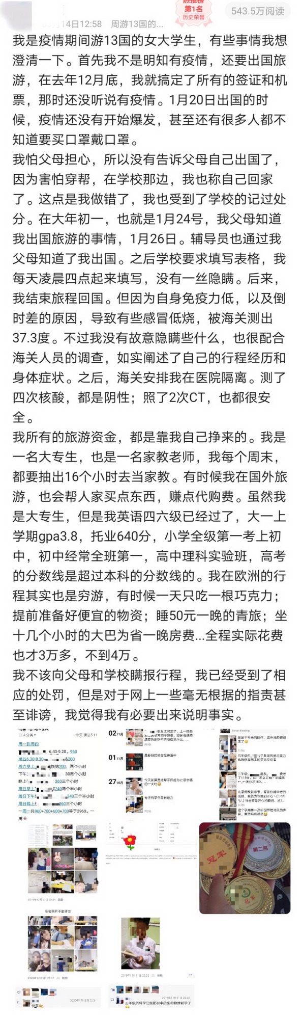 記者從小Y處了解到,1月20日,她出發(fā)開始旅行并于3月3日從珠海入境回國(guó),期間共游玩13個(gè)國(guó)家。“10月份就已經(jīng)決定出去玩,11月一直在準(zhǔn)備簽證,12月中旬簽證什么的都已經(jīng)準(zhǔn)備好了。”由于害怕父母擔(dān)心她一人在外旅行的安全問題,出發(fā)時(shí)并沒有告知父母?!?月23日,學(xué)校要求所有學(xué)生填寫一個(gè)假期所在地,我填寫的是‘在家’,因?yàn)椴幌胱尲依锶酥牢以趪?guó)外,害怕穿幫。出發(fā)時(shí)國(guó)內(nèi)疫情還沒有爆發(fā),所以不是很清楚國(guó)內(nèi)的疫情,也沒想到填這個(gè)信息是為了防控疫情所用,所以沒有如實(shí)填寫。大年初一,也就是1月24日,我父母知道了我出國(guó)的事,對(duì)我嚴(yán)厲批評(píng)。之后學(xué)校要求填寫表格,我沒有隱瞞,都是如實(shí)填寫?!?/p>