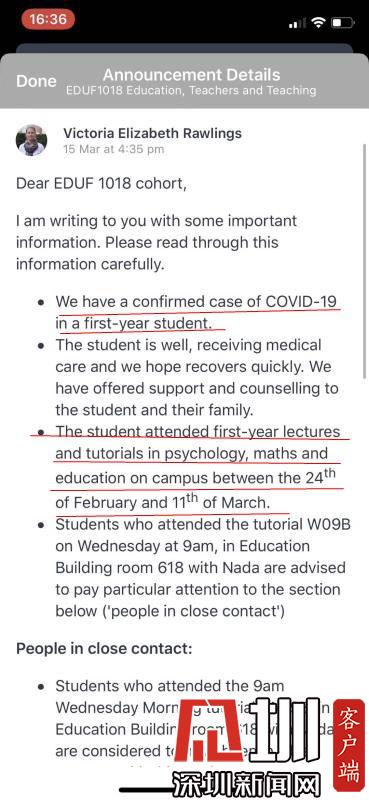 澳大利亞悉尼大學(xué)出現(xiàn)確診患者,圖為校方郵件,紅線處是確診學(xué)生的情況以及參加過的校內(nèi)活動軌跡。