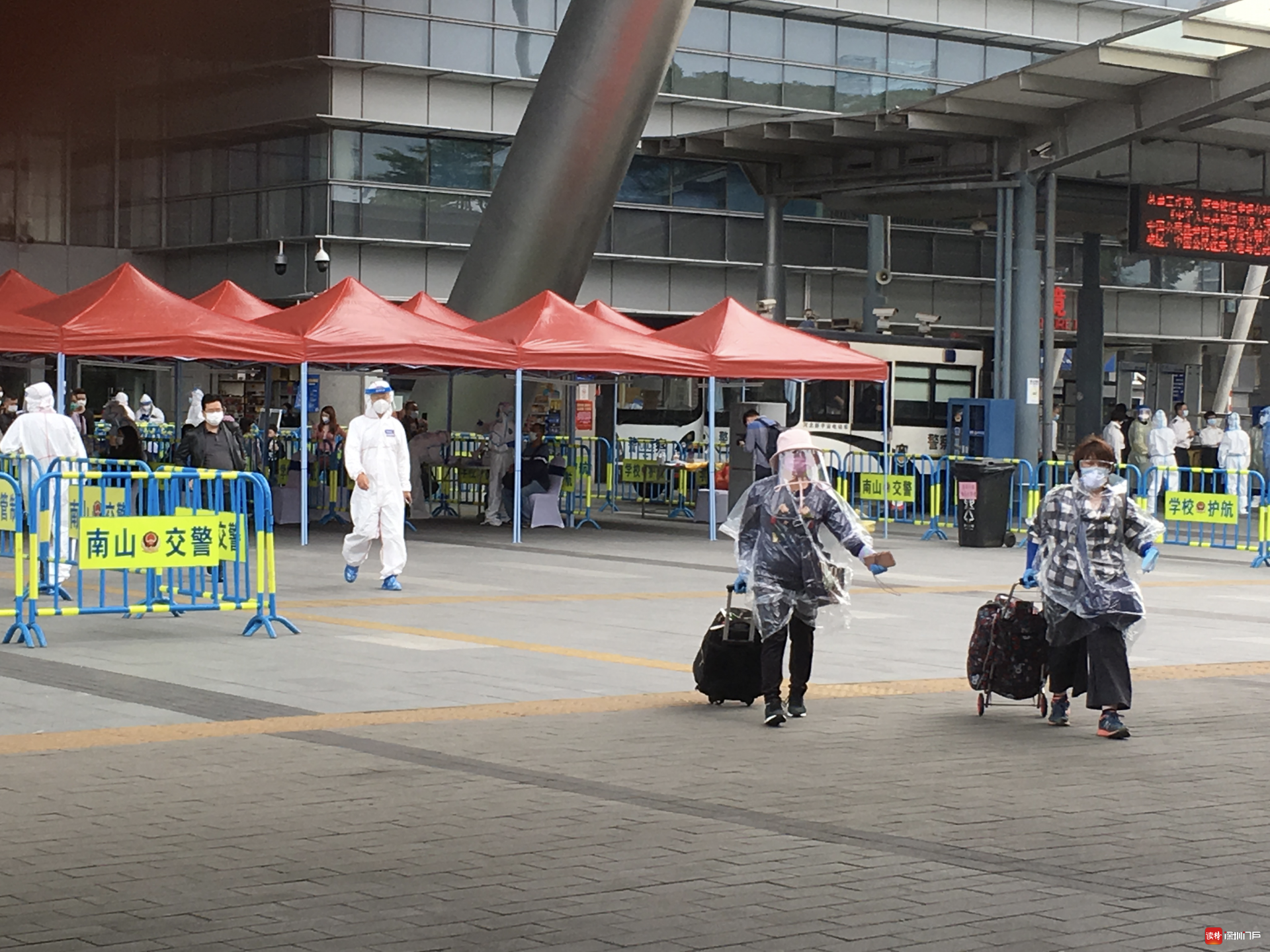 “排隊排了好幾個小時,終于出來了!”頭戴帽子、護目鏡和口罩,外加一襲透明“雨衣”的趙女士把自己包裹得嚴嚴實實,走到深圳灣口岸北廣場外才把帽子摘了,額頭微微出汗。她告訴記者,上午10點鐘她從香港出境,直到下午2點才通關(guān)。香港居民鐘先生是一名大學(xué)生,因老家有事才入境,他比趙女士要幸運一些,從11點開始通關(guān)的他花了2個多小時。
