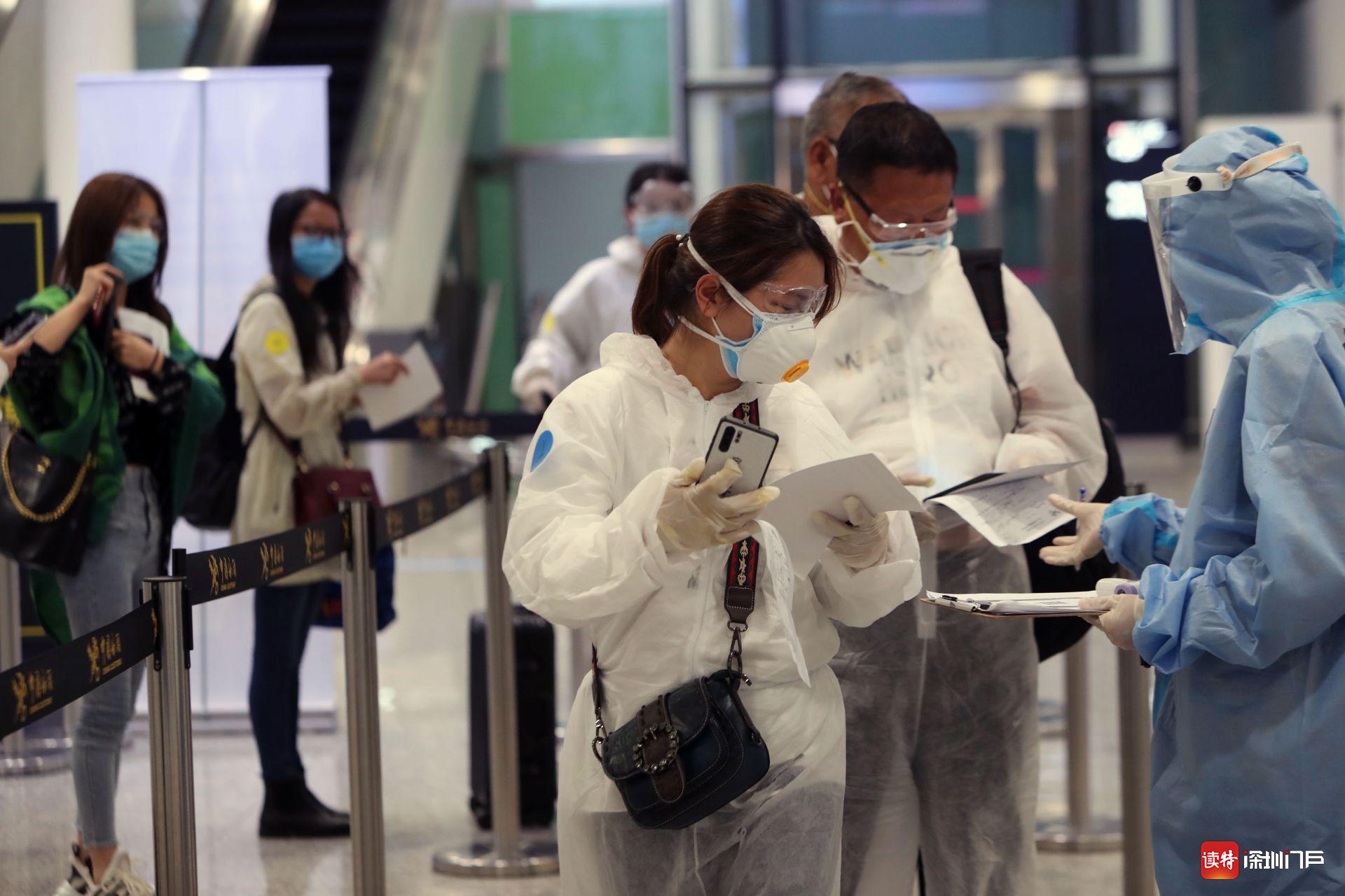 現(xiàn)場(chǎng)關(guān)員一一核對(duì)健康申報(bào)卡,并仔細(xì)詢問(wèn)旅客過(guò)去旅居史,同時(shí)手持測(cè)溫儀對(duì)每一個(gè)旅客進(jìn)行測(cè)溫,監(jiān)測(cè)體溫情況。