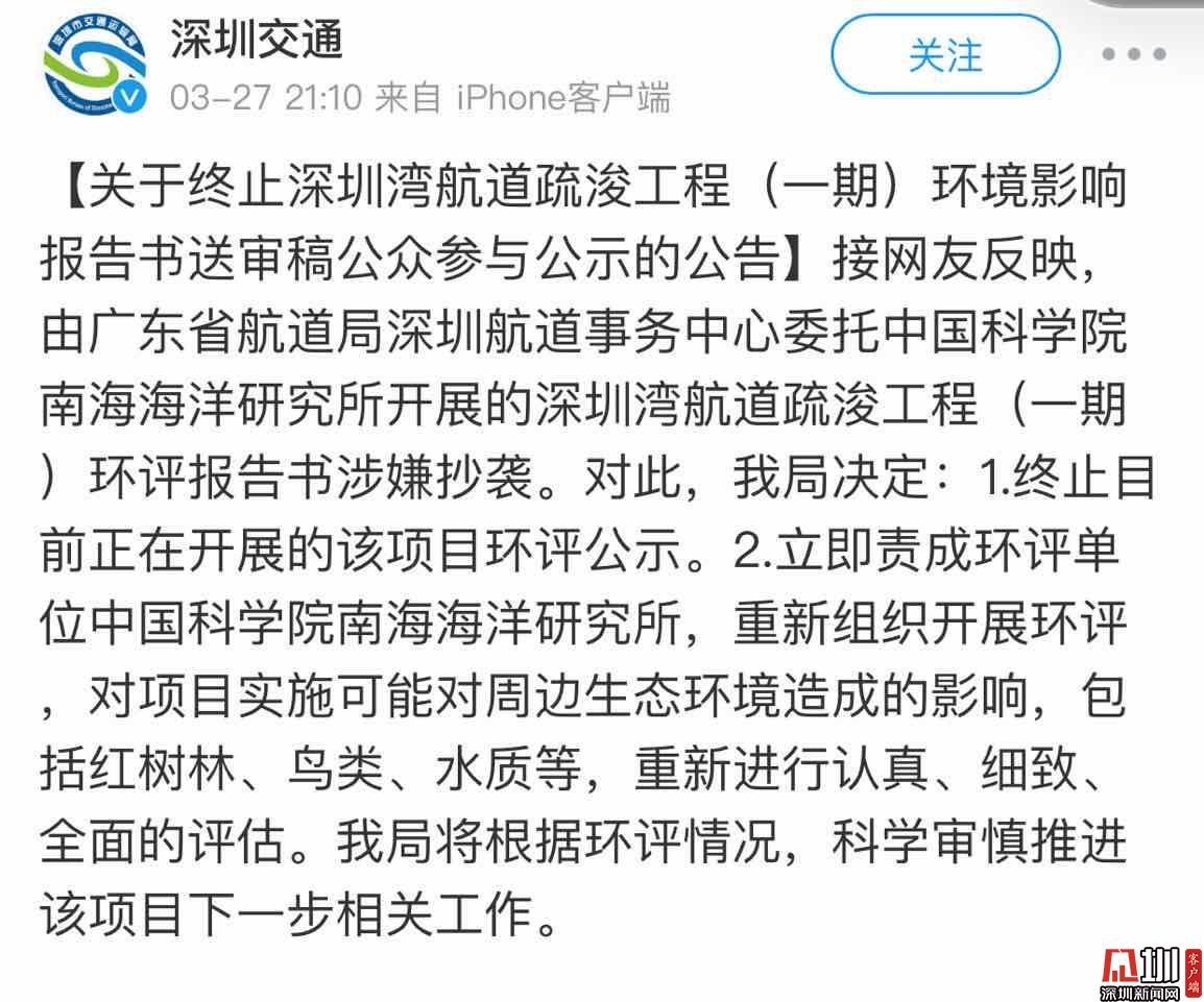 3月27日21時(shí)10分,深圳市交通運(yùn)輸管理局官方微博發(fā)布消息稱:接網(wǎng)友反映,由廣東省航道局深圳航道事務(wù)中心委托中國(guó)科學(xué)院南海海洋研究所開(kāi)展的深圳灣航道疏浚工程(一期)環(huán)評(píng)報(bào)告書(shū)涉嫌抄襲。對(duì)此,深圳市交通運(yùn)輸管理局決定:1.終止目前正在開(kāi)展的該項(xiàng)目環(huán)評(píng)公示。2.立即責(zé)成環(huán)評(píng)單位中國(guó)科學(xué)院南海海洋研究所,重新組織開(kāi)展環(huán)評(píng),對(duì)項(xiàng)目實(shí)施可能對(duì)周邊生態(tài)環(huán)境造成的影響,包括紅樹(shù)林、鳥(niǎo)類、水質(zhì)等,重新進(jìn)行認(rèn)真、細(xì)致、全面的評(píng)估。深圳市交通運(yùn)輸管理局將根據(jù)環(huán)評(píng)情況,科學(xué)審慎推進(jìn)該項(xiàng)目下一步相關(guān)工作。