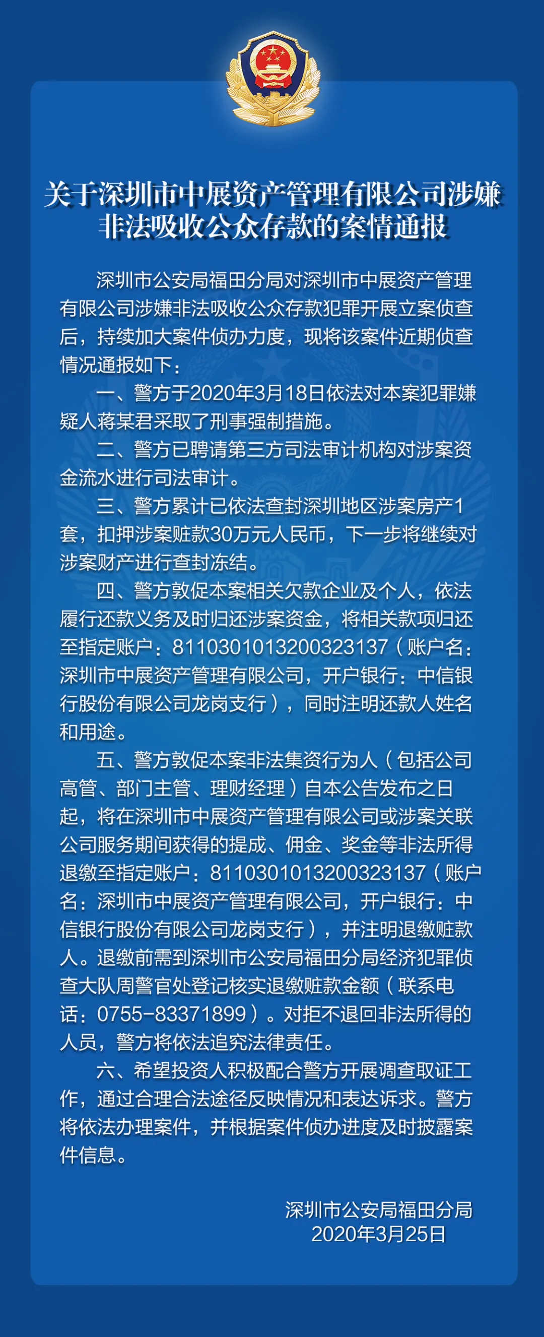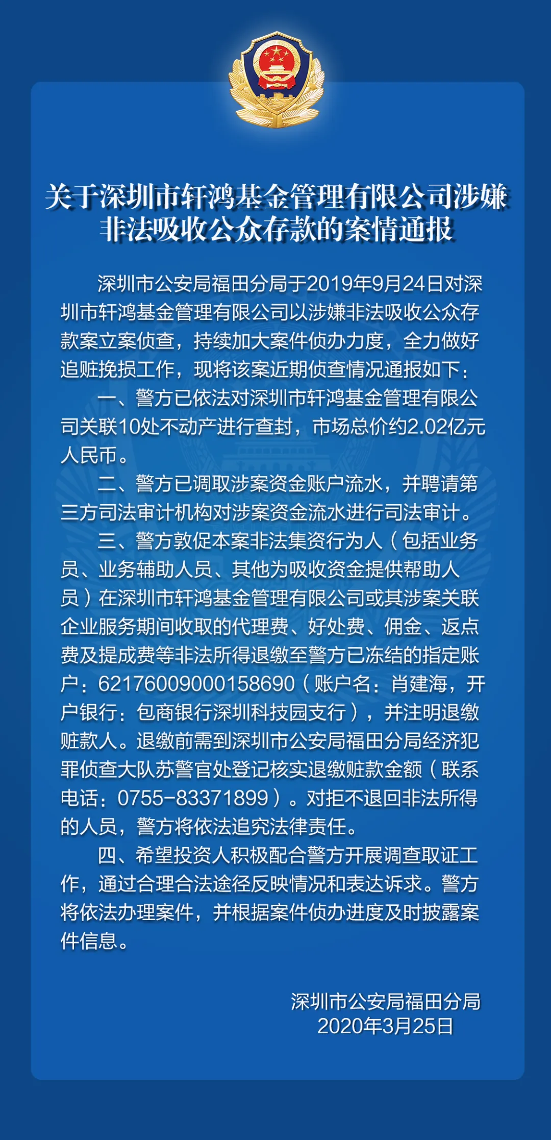關于深圳市軒鴻基金管理有限公司、深圳市中展資產(chǎn)管理有限公司涉嫌非法吸收公眾存款的案件情況通報