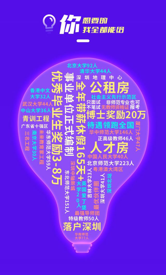 記者了解到,本輪招聘采取只面試、不筆試方式,非師范專業(yè)、無教師資格證者也可報考。一經(jīng)錄用,應(yīng)聘者可享受事業(yè)單位正式編制、落戶深圳、人才房、公租房、全年帶薪休假165天等待遇。其中,優(yōu)秀畢業(yè)生還將享受3萬 -8萬元獎勵,博士研究生享受20萬元獎勵,待遇領(lǐng)跑全國。