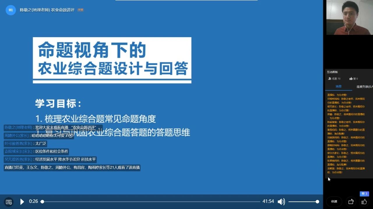 地理科李金鳳老師在《農(nóng)業(yè)區(qū)位因素及其變化》一課中組織了線上分組討論,并對(duì)小組討論的結(jié)果逐一點(diǎn)評(píng),及時(shí)反饋。