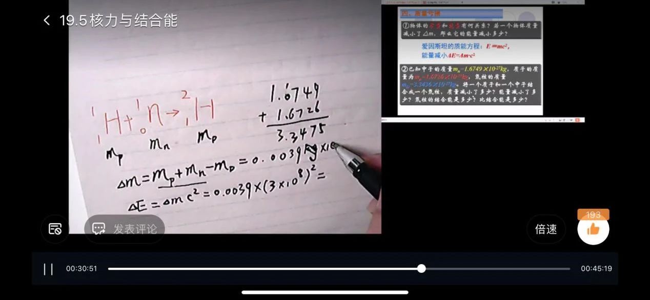 物理科何揚(yáng)峰老師在執(zhí)教《核力與結(jié)合能》一課時(shí)靈活運(yùn)用手寫板、電腦和手機(jī)等多種工具,讓學(xué)生能夠同時(shí)看到PPT和教師板書畫面,完美地還原了在校學(xué)習(xí)情境。