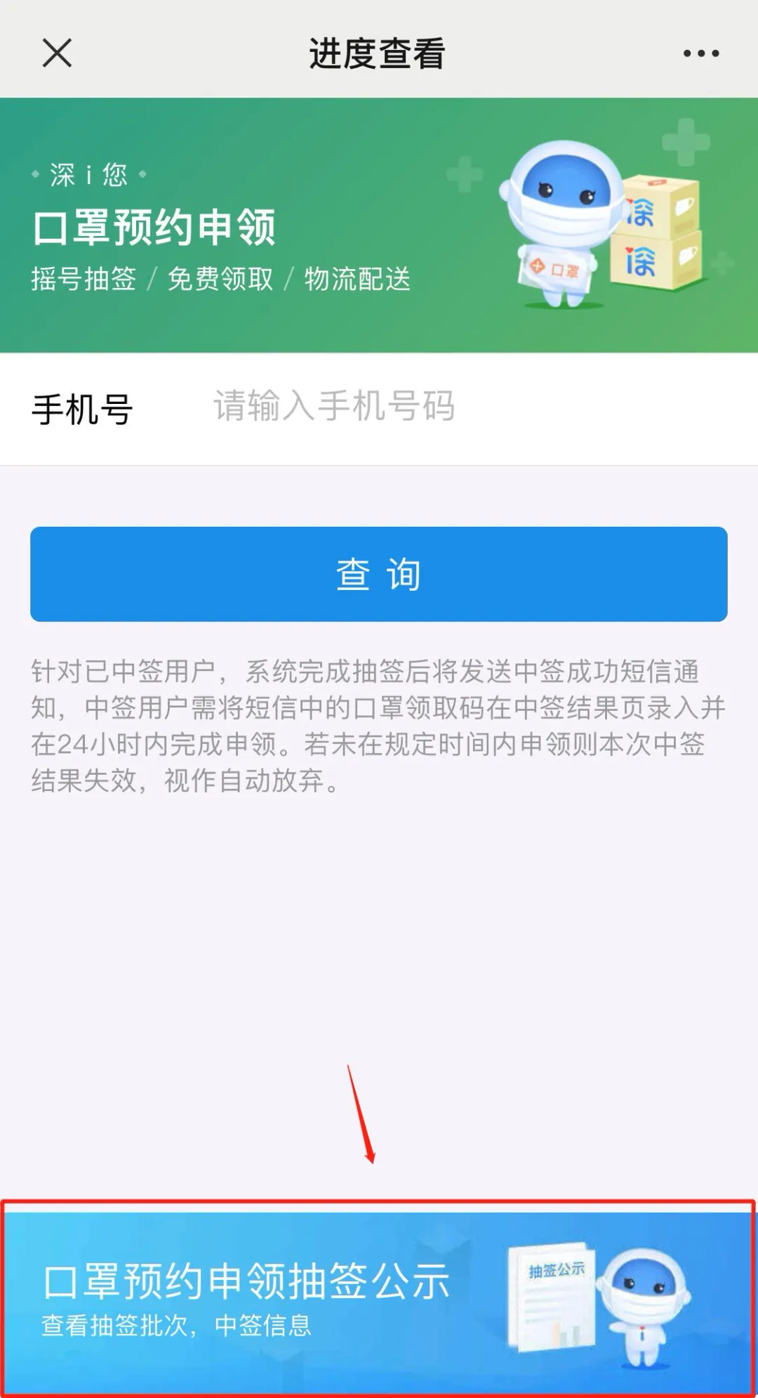 個人中簽名單:可在“i深圳”微信公眾號首頁-口罩預(yù)約-市民專區(qū)-進度查看的頁面下方“口罩預(yù)約申領(lǐng)抽簽公示”查看