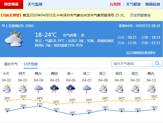 見圳客戶端·深圳新聞網(wǎng)2020年4月2日訊 深圳市氣象局預(yù)計(jì)2日陰天間多云,有分散陣雨,沿海和高地偏東陣風(fēng)6-7級,氣溫18-22℃;3日多云間陰天,有輕霧和分散陣雨,氣溫略升;展望清明假期(4-6日)有一次明顯降雨過程,間中伴有雷暴。7日降雨結(jié)束。