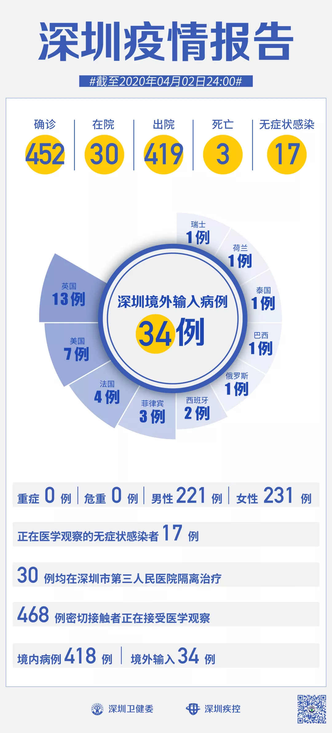 截至4月2日24時(shí),深圳累計(jì)報(bào)告新冠肺炎病例452例。4月2日當(dāng)天新增1例境外輸入病例。