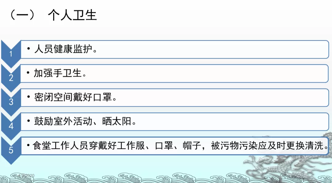 五是做好教育培訓(xùn)工作。學(xué)校要開展多種形式的健康宣教,普及新冠肺炎防控知識,組織師生學(xué)習(xí)教育部和市教育局下發(fā)的各類指南和防疫知識。