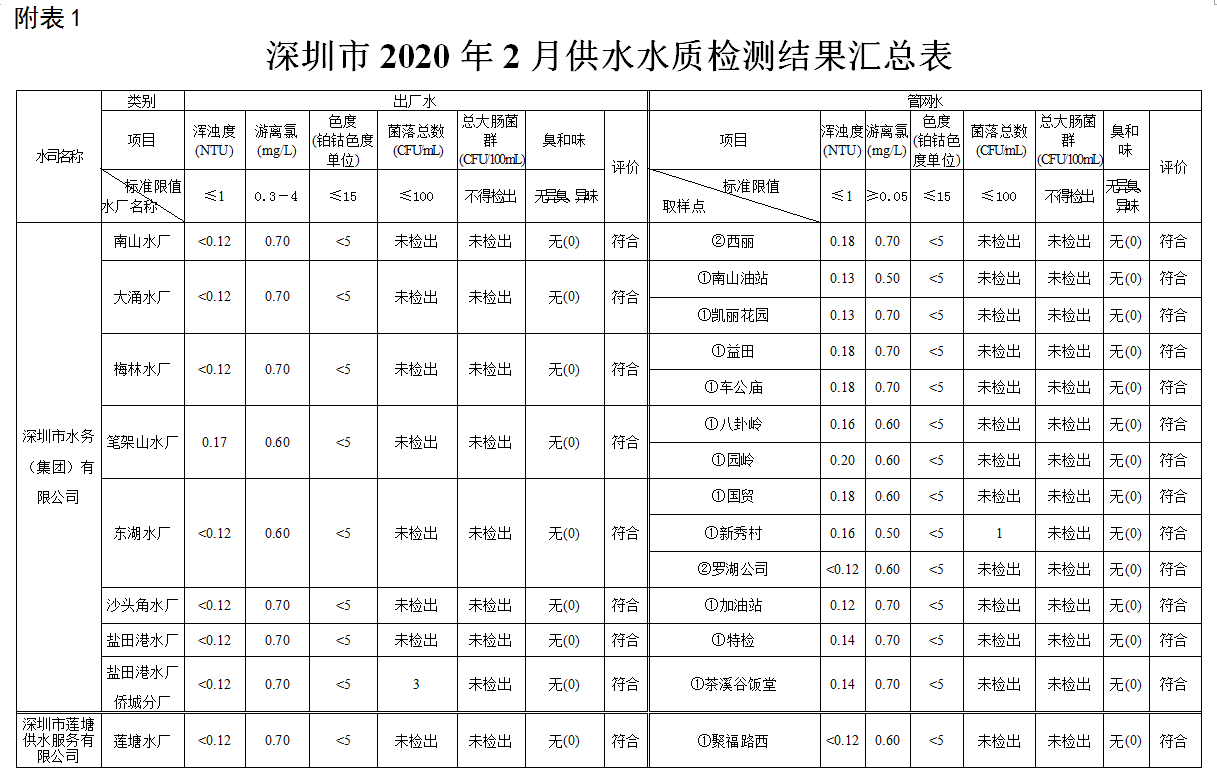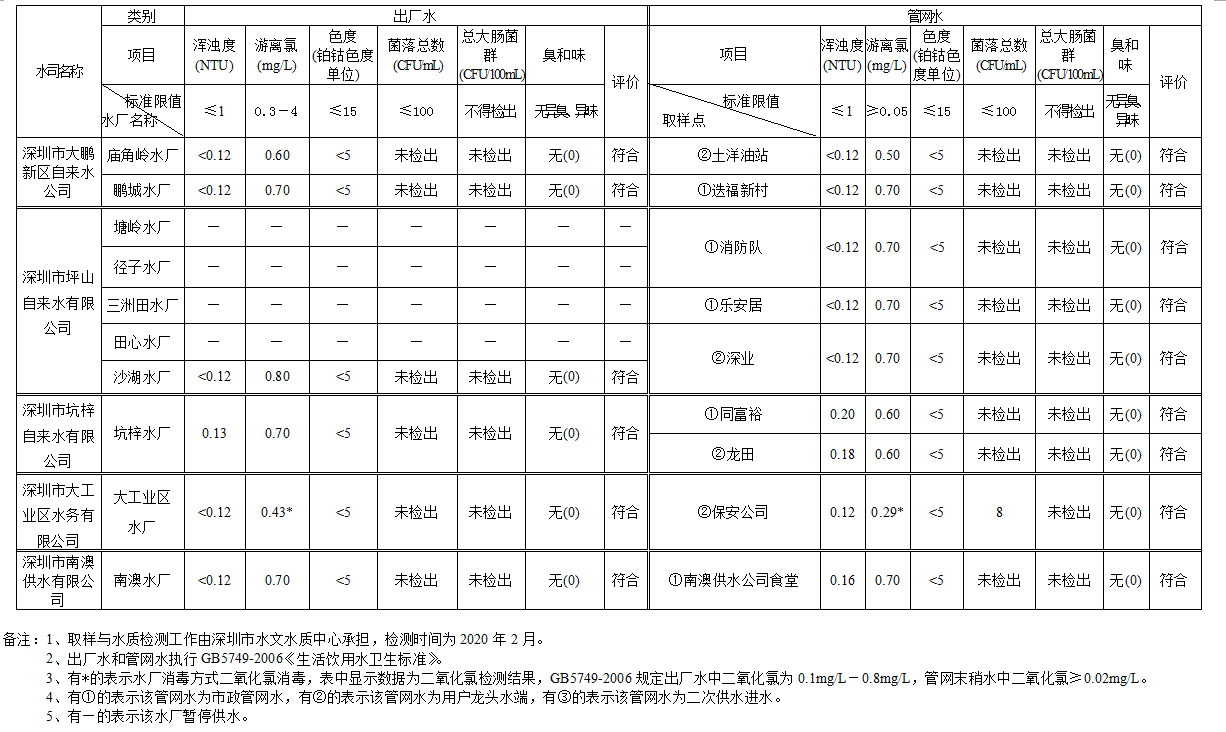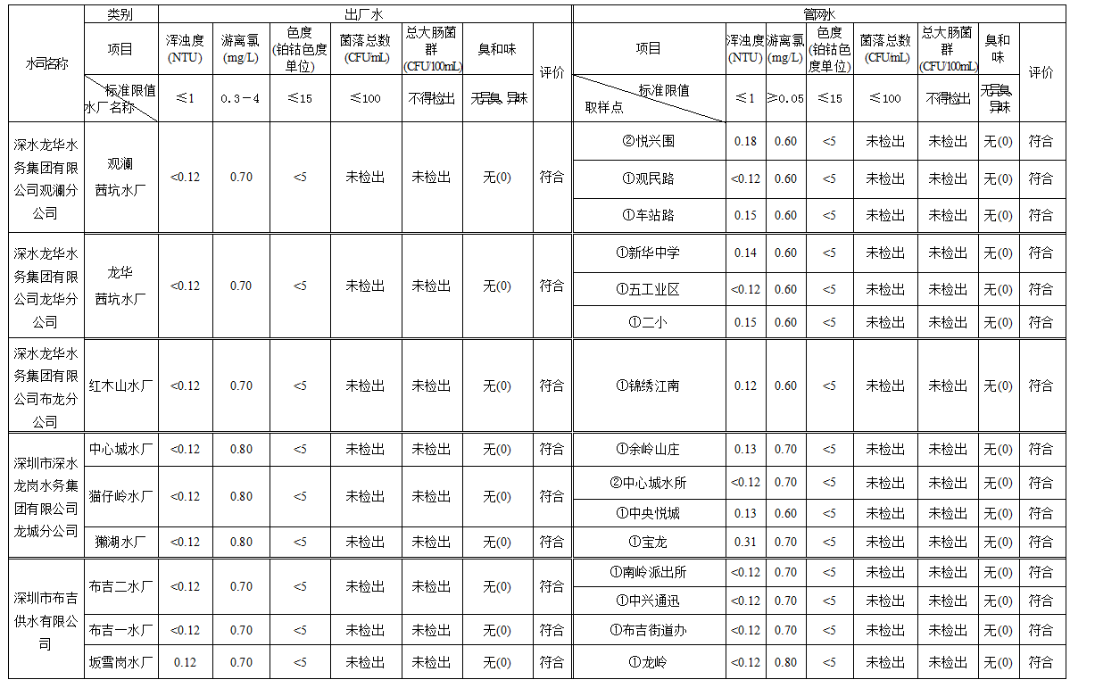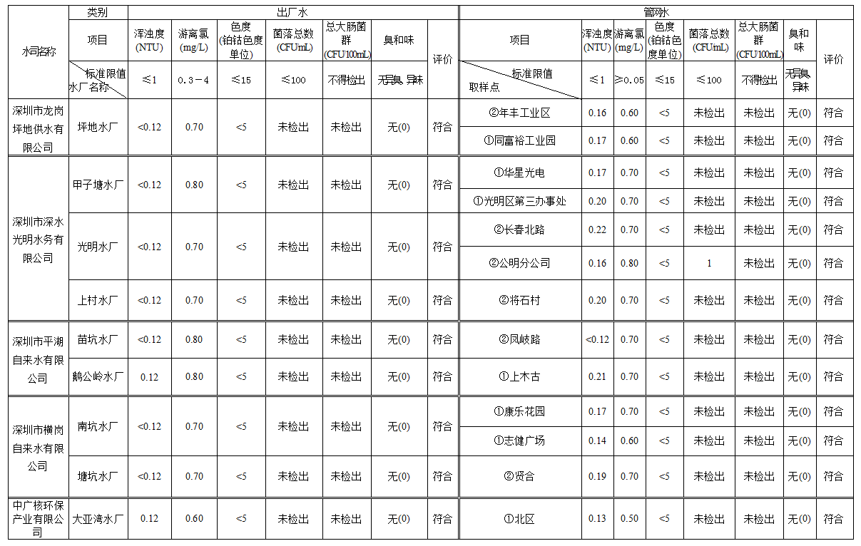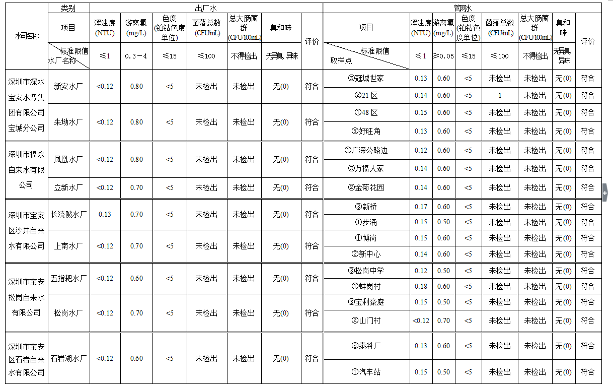 見(jiàn)圳客戶(hù)端·深圳新聞網(wǎng)2020年4月4日訊(見(jiàn)圳客戶(hù)端、深圳新聞網(wǎng)記者葉梅)2020年2月,深圳市水務(wù)局對(duì)全市42個(gè)水廠(chǎng)出廠(chǎng)水水樣以及68個(gè)管網(wǎng)水水樣進(jìn)行了抽檢。檢測(cè)結(jié)果表明,依據(jù)GB5749—2006《生活飲用水衛(wèi)生標(biāo)準(zhǔn)》,所有受檢42個(gè)出廠(chǎng)水水樣和68個(gè)管網(wǎng)水水樣的渾濁度、消毒劑(游離氯或二氧化氯或總氯)、色度、菌落總數(shù)、總大腸菌群及臭和味共6項(xiàng)常規(guī)指標(biāo)全部符合該標(biāo)準(zhǔn)的規(guī)定,出廠(chǎng)水水樣合格率為100%,管網(wǎng)水合格率為100%。