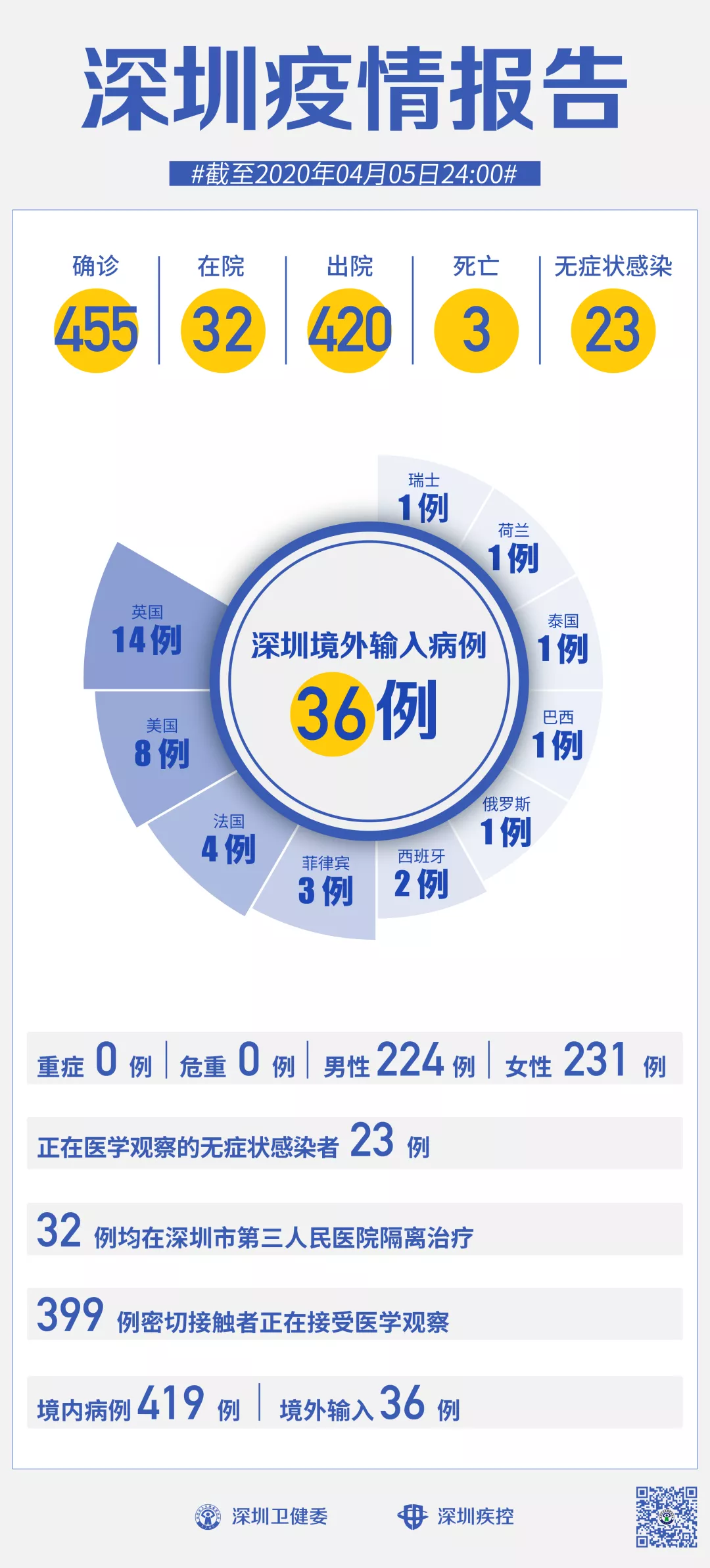 截至4月5日24時,深圳累計報告新冠肺炎病例455例。4月5日當天新增境內病例1例,新增無癥狀感染者2例,出院1例。