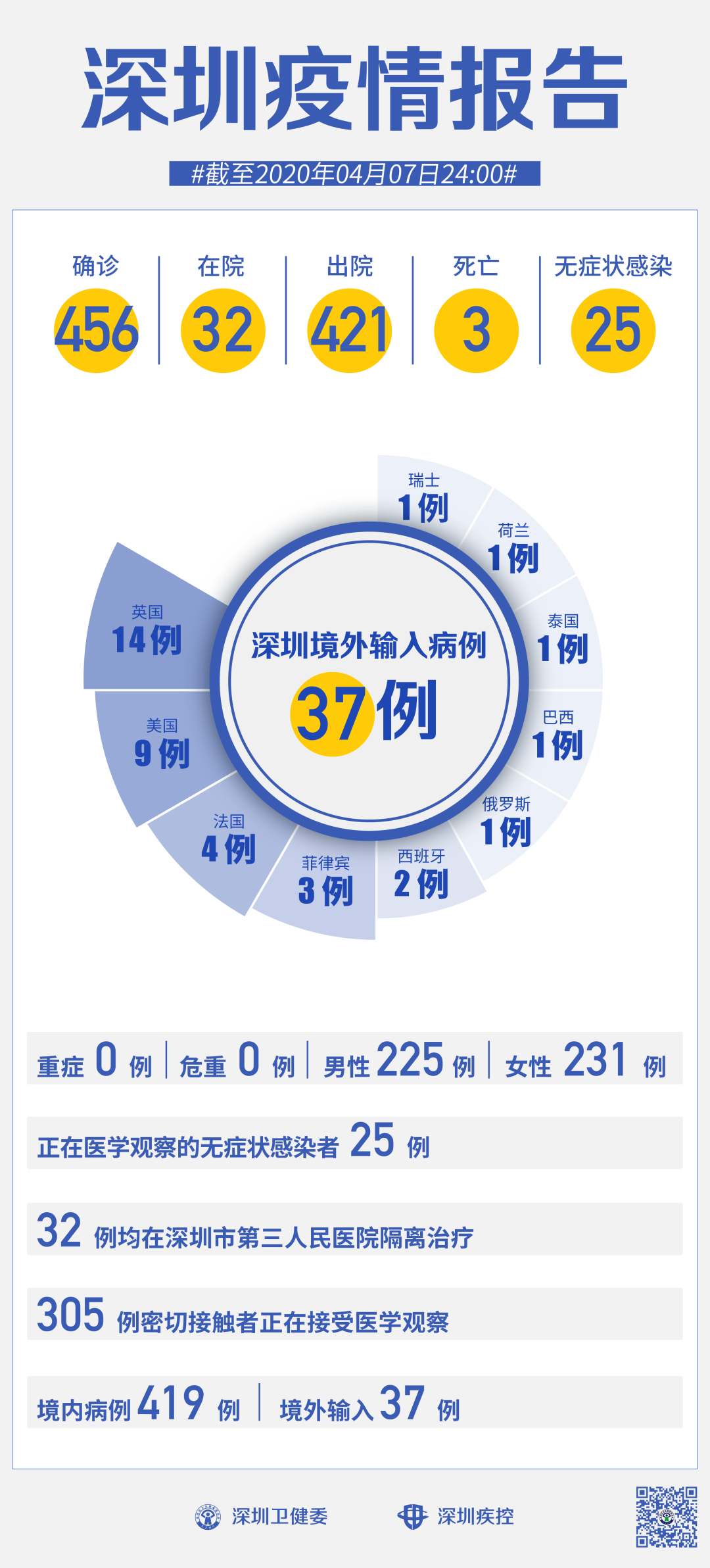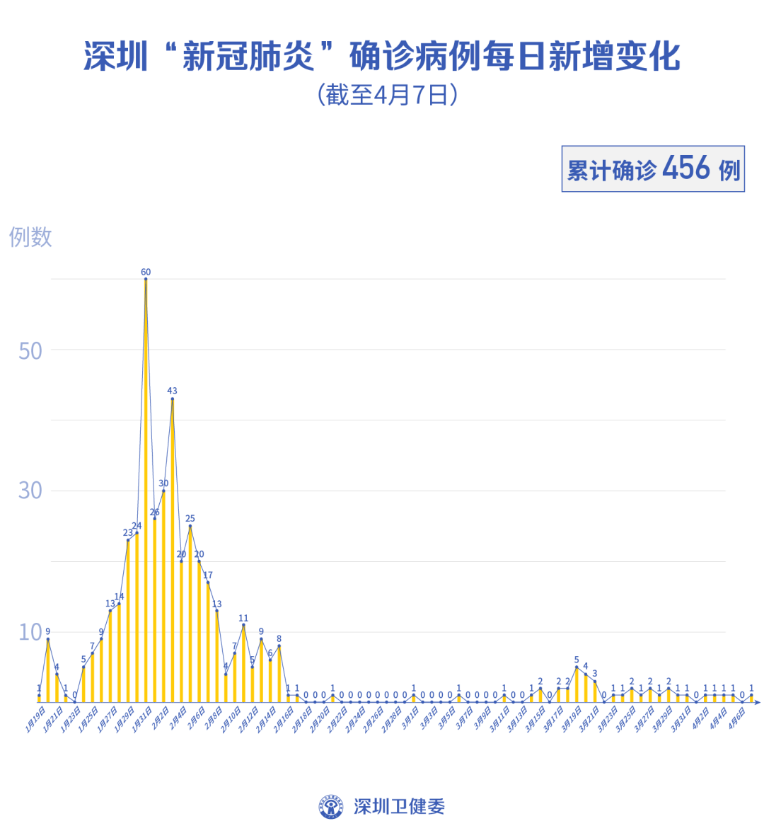 截至4月7日24時,深圳累計報告新冠肺炎病例456例。4月7日當(dāng)天新增境外輸入病例1例,新增無癥狀感染者1例,出院1例。