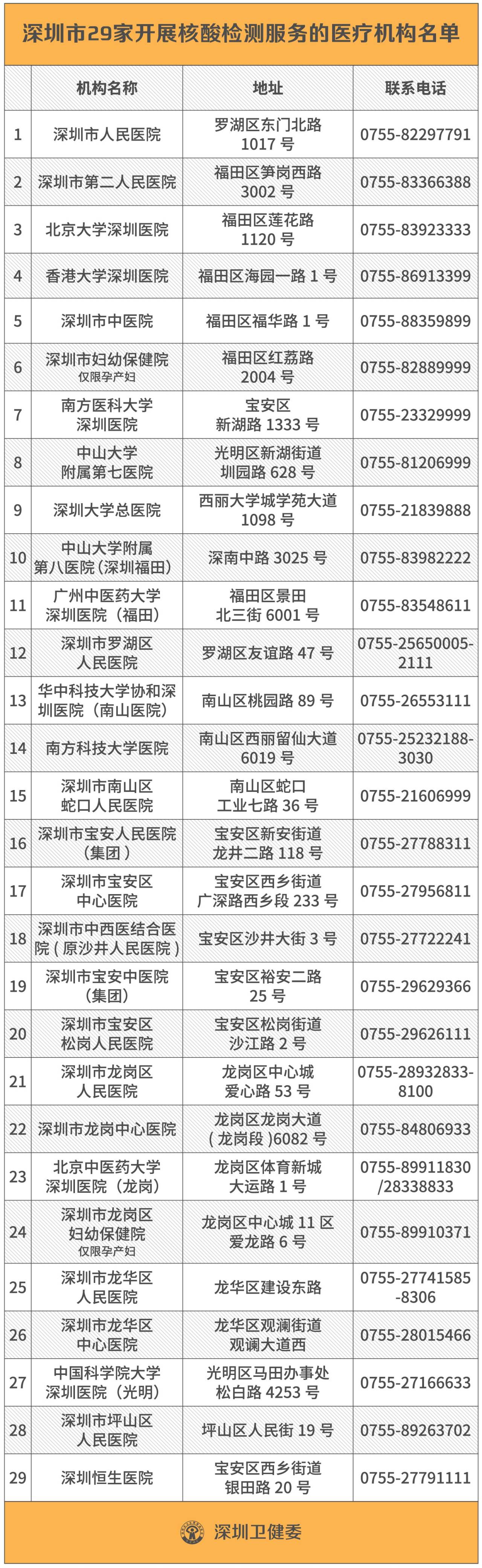 深圳公布29家面向公眾開展新冠病毒核酸檢測(cè)服務(wù)的醫(yī)院名單