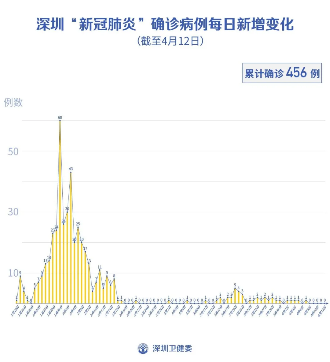 截至4月12日24時,深圳累計報告新冠肺炎病例456例。4月12日當(dāng)天新增無癥狀感染者1例。