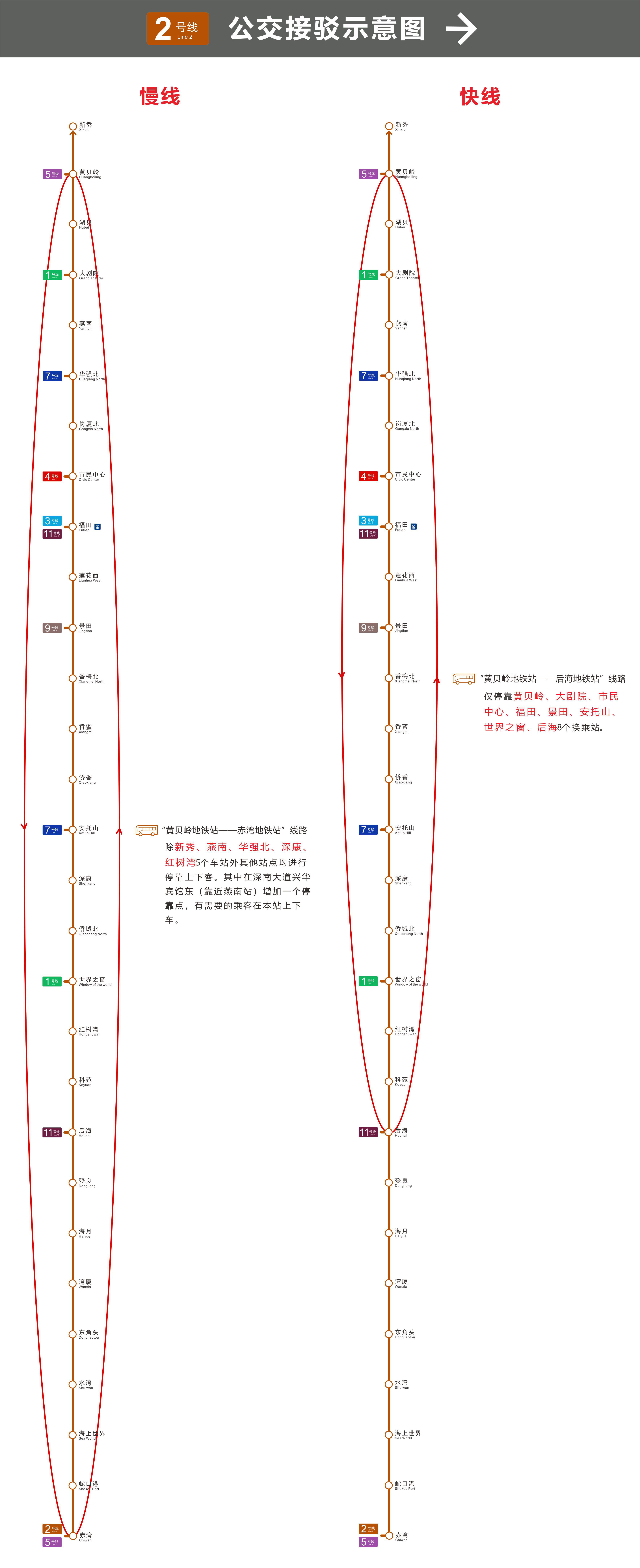 為了方便期間市民乘客的出行,屆時(shí)將組織循環(huán)開行2號(hào)線的兩條公交接駁線路。1、公交接駁慢線:“黃貝嶺站—赤灣站”。除新秀、燕南、華強(qiáng)北、深康、紅樹灣5個(gè)站點(diǎn)不??恐猓溆喔髡揪?可舷驴?。2、公交接駁快線:“黃貝嶺站—后海站”。僅??奎S貝嶺、大劇院、市民中心、福田、景田、安托山、世界之窗、后海共8個(gè)換乘站。