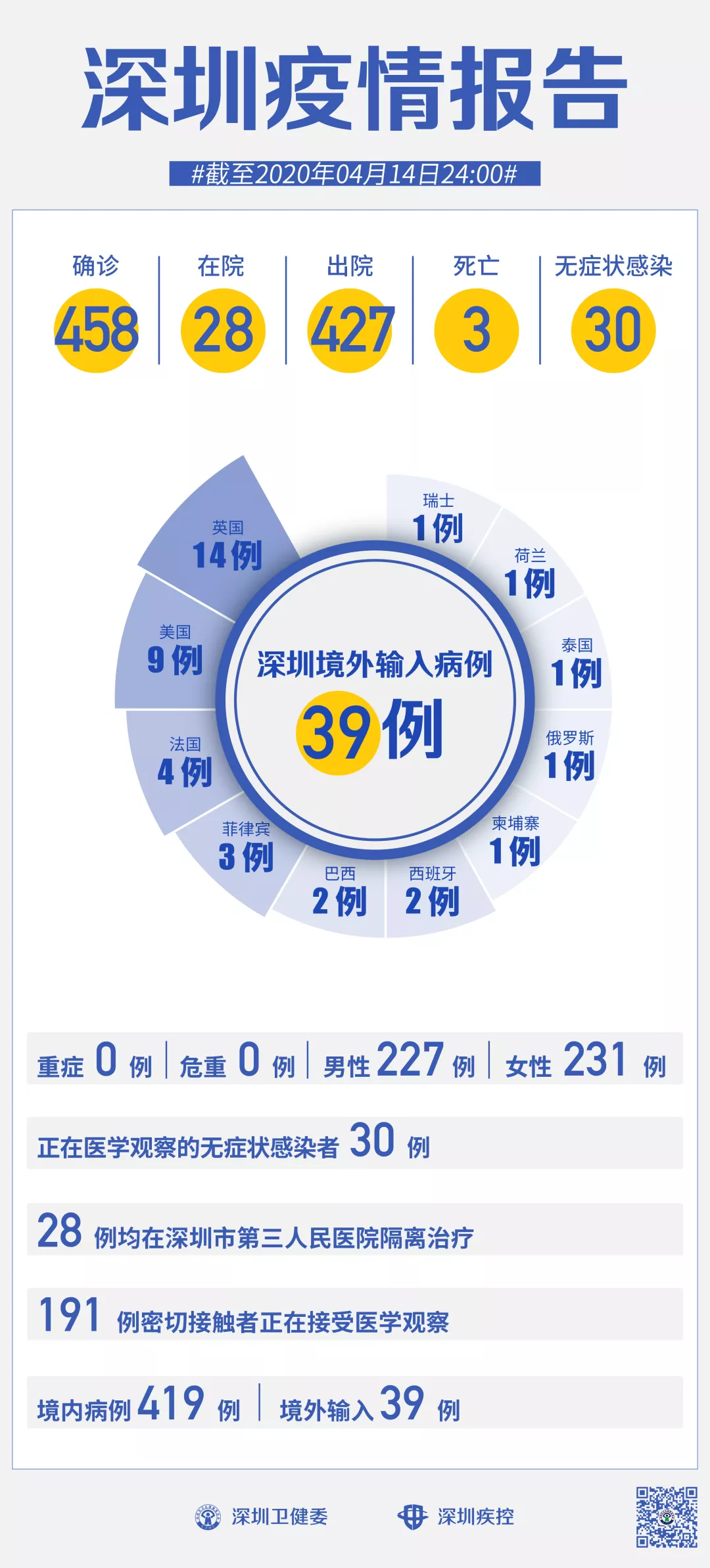 截至4月14日24時(shí),深圳累計(jì)報(bào)告新冠肺炎病例458例。4月14日當(dāng)天新增出院3例。