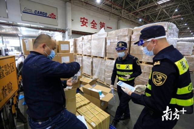 深圳海關(guān)保障深圳向國際友好城市捐贈(zèng)的抗擊疫情物資順暢通關(guān)。圖為海關(guān)人員正在檢查貨場防疫物資。南方日報(bào)記者朱洪波攝
