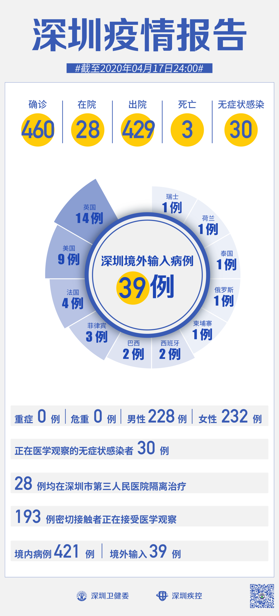 截至4月17日24時,深圳累計報告新冠肺炎病例460例。4月17日當天新增境內病例1例。