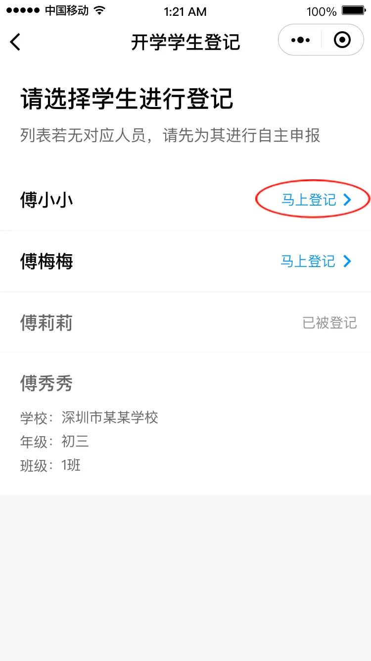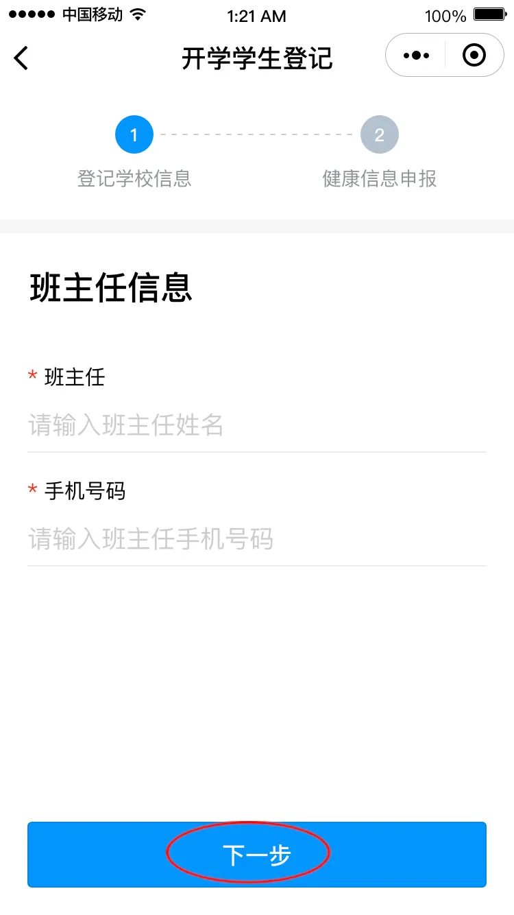 進入“開學學生登記”頁面,點擊“馬上登記”進入登記界面,填寫班主任姓名和手機號碼后點擊“下一步”,請選擇對應(yīng)的班級,進入健康申報卡界面。