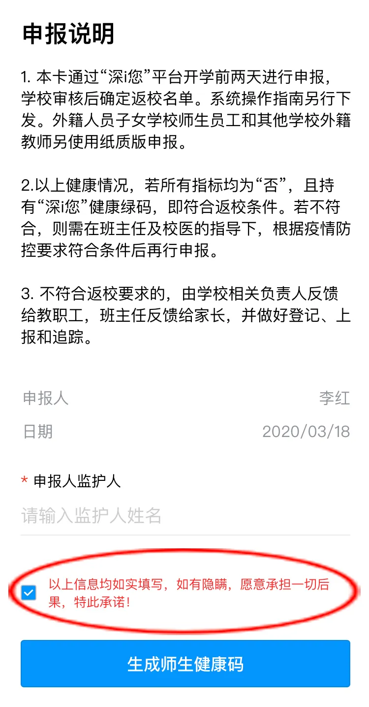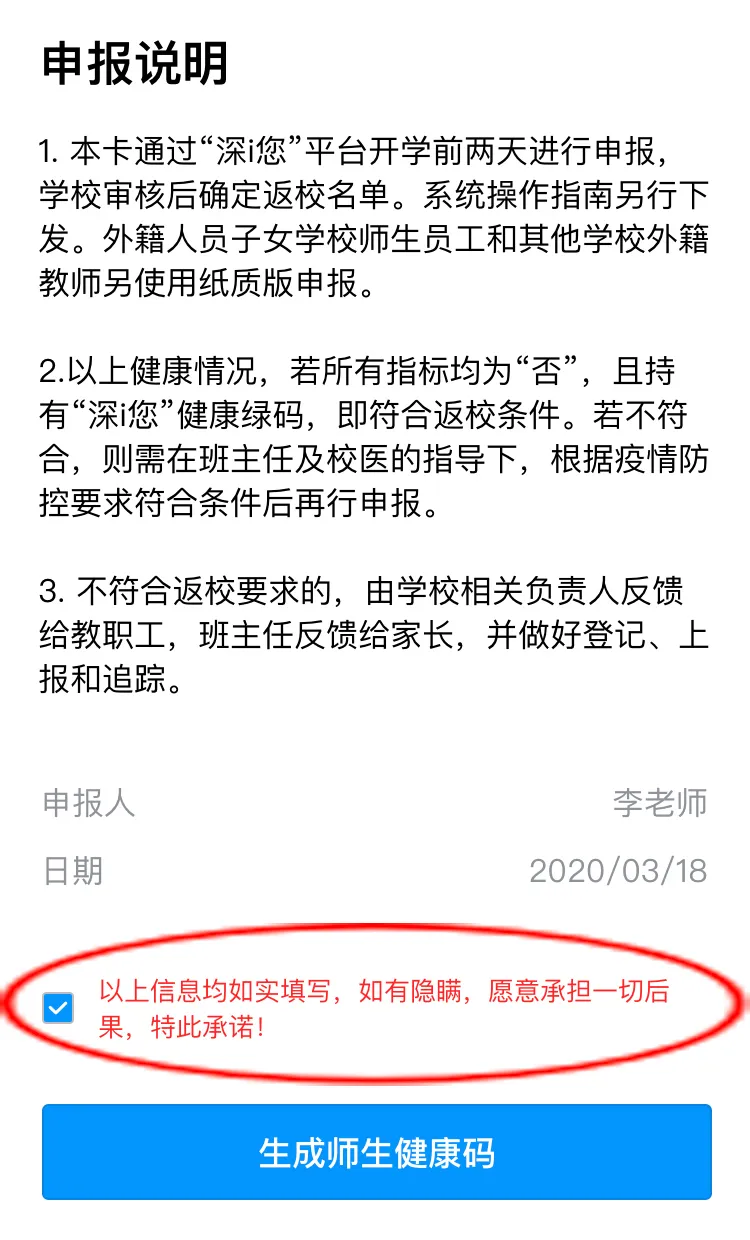 健康信息申報后,請勾選申報承諾,點擊“生成師生健康碼”即可完成健康申報。