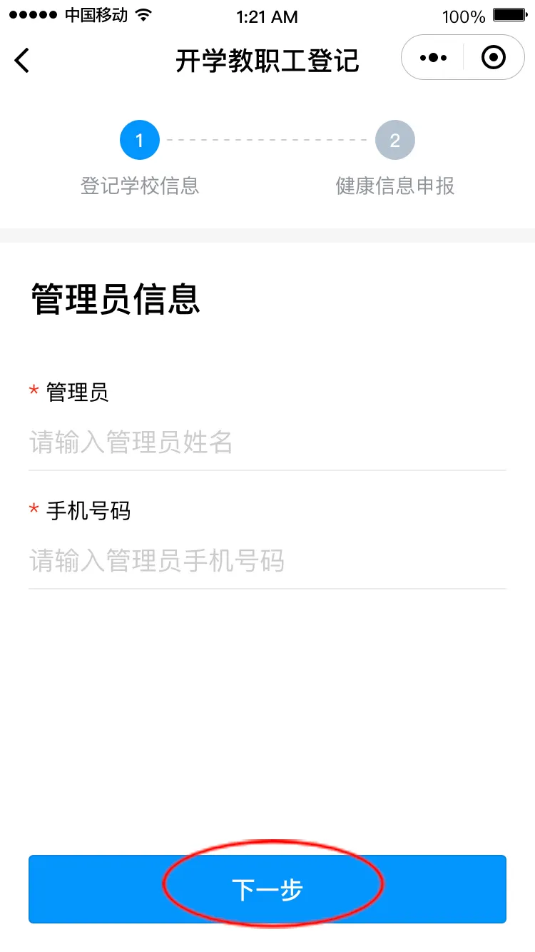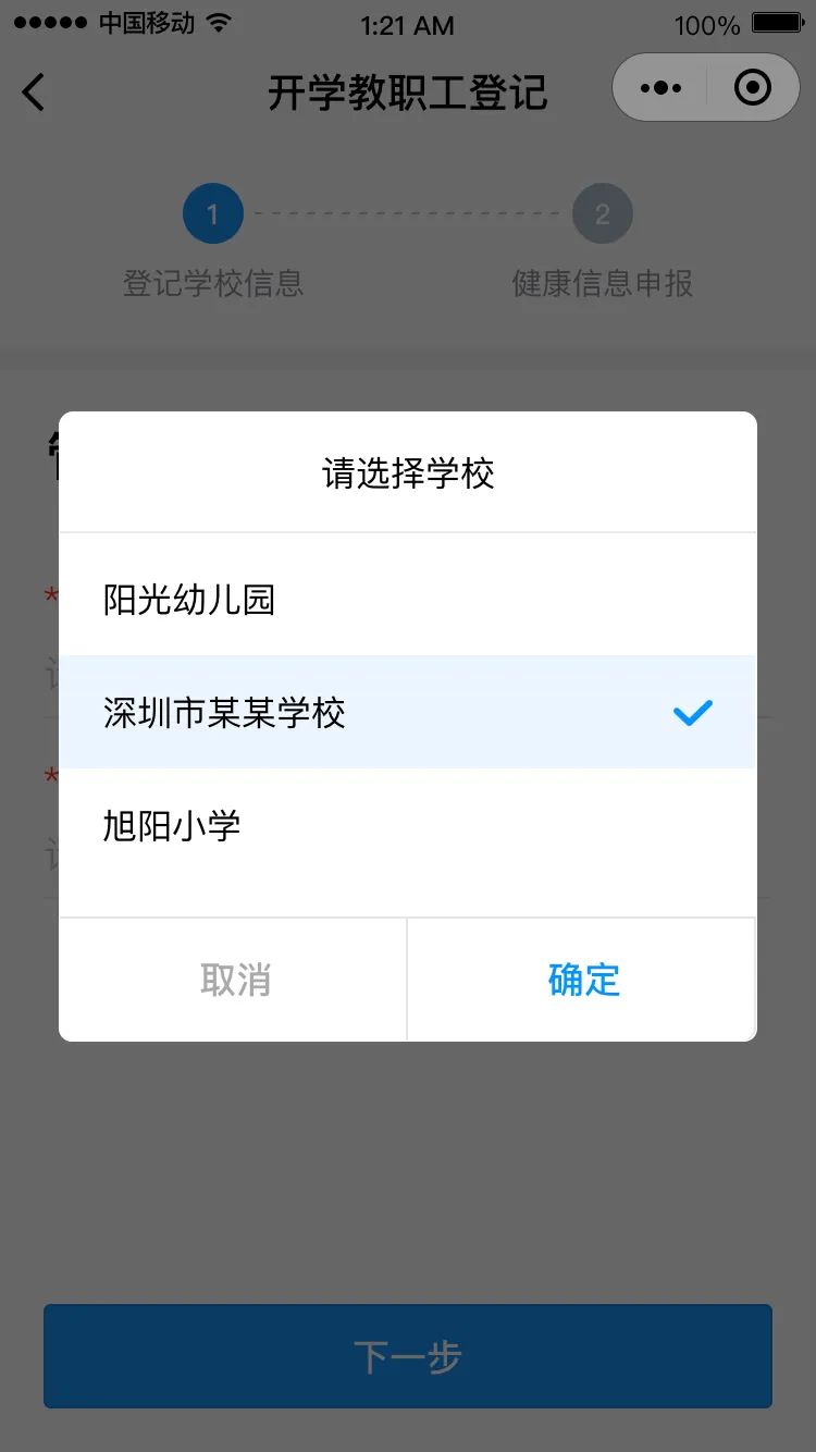 點擊“馬上登記”進入登記界面,填寫學校管理員姓名和手機號碼(學校管理員姓名和手機號碼請詢問學校獲得),點擊“下一步”,請選擇對應(yīng)的學校,進入健康申報卡界面。
