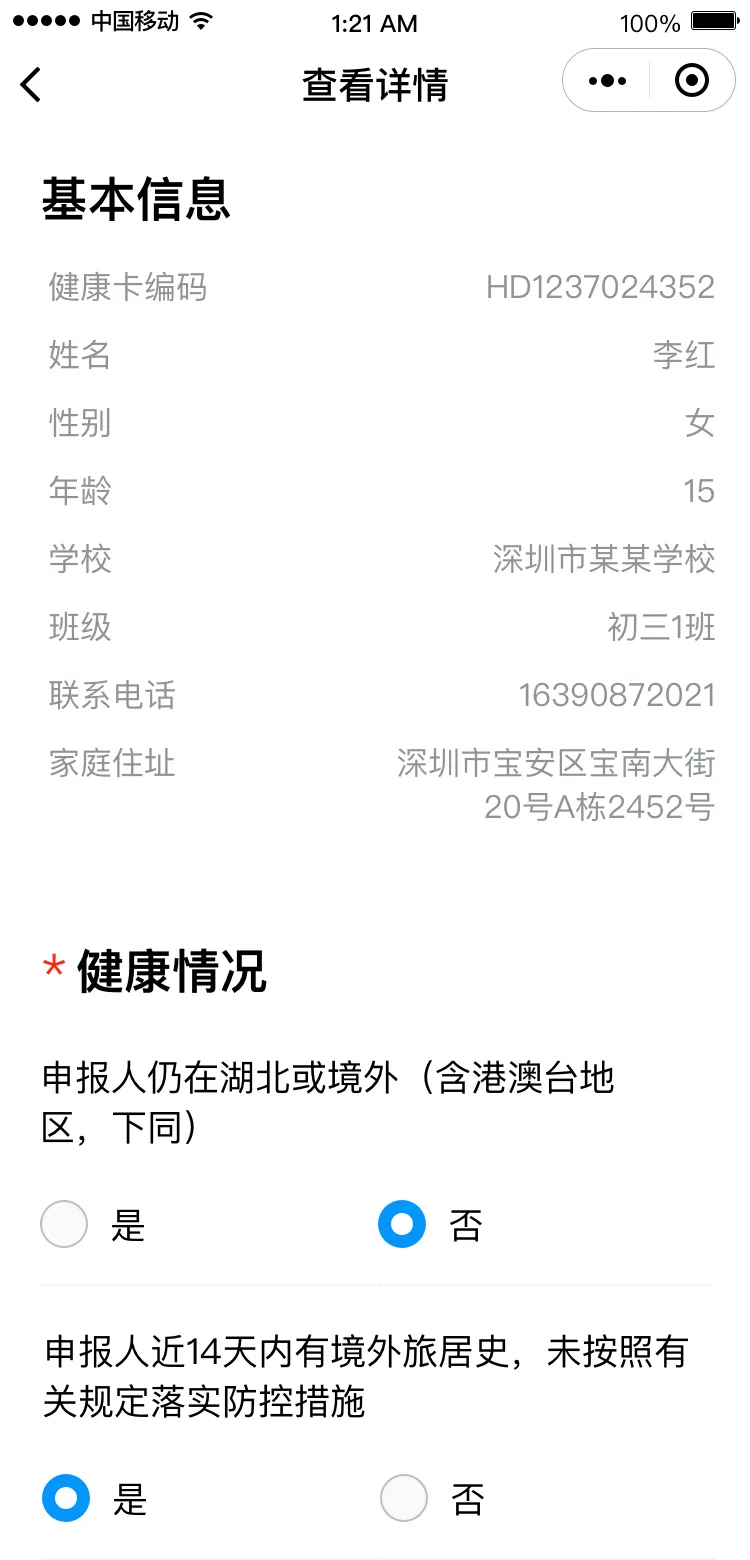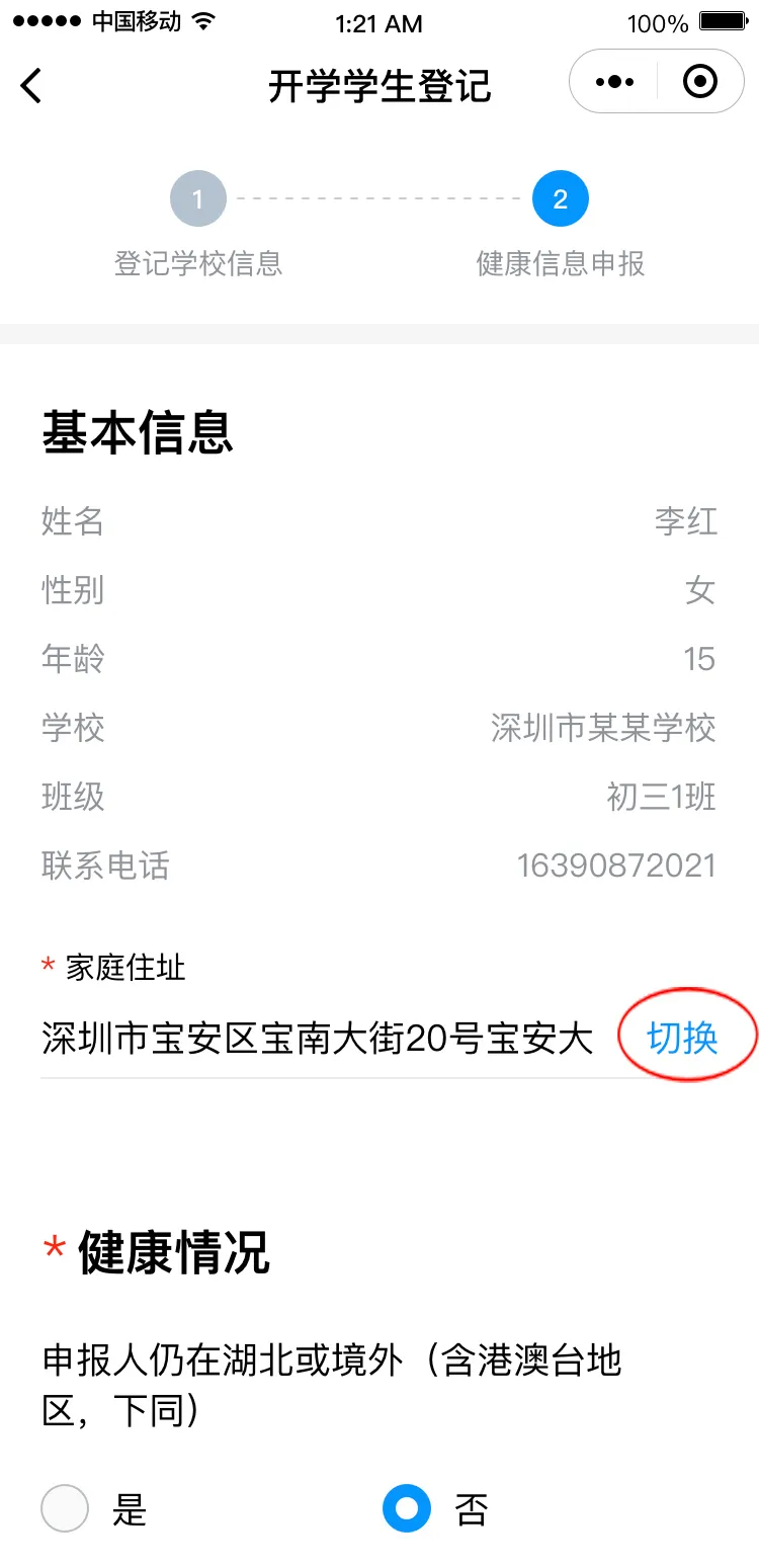 請根據(jù)實際情況完成健康信息申報,包括選擇家庭住址、申報健康情況、填寫監(jiān)護人姓名。