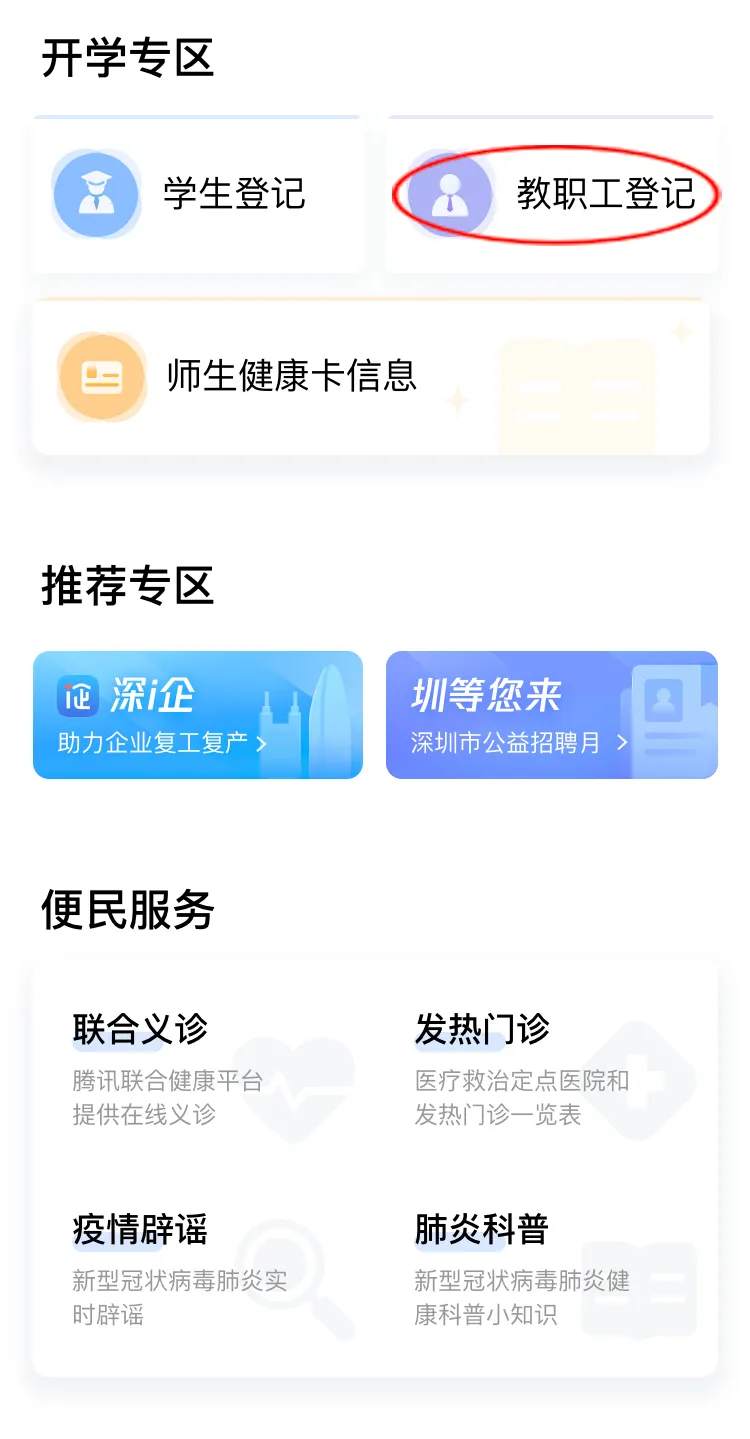 在開學專區(qū),點擊“教職工登記”進行自主申報和實名認證。