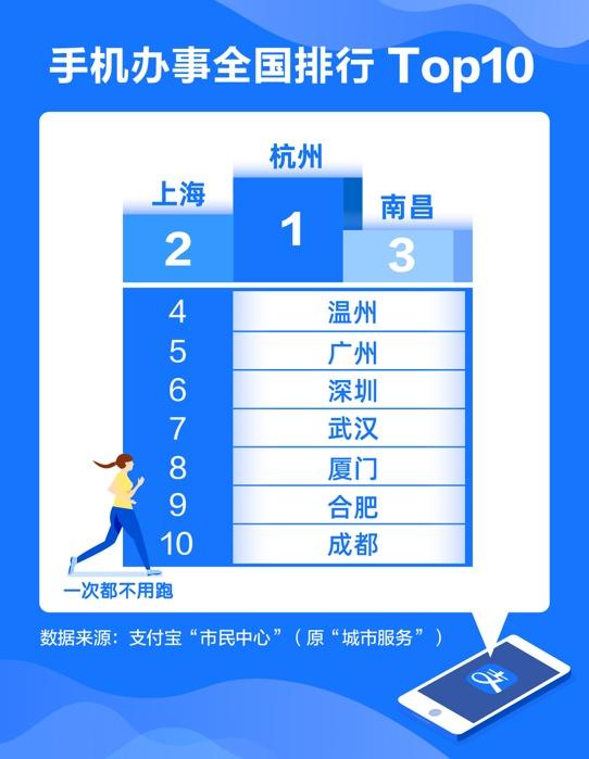 4月21日,支付寶“市民中心”發(fā)布的全國(guó)手機(jī)辦事排行榜顯示,已有超過(guò)300城的市民服務(wù)能在手機(jī)上完成。其中,杭州、上海、南昌等地的市民能在手機(jī)上辦的事最多。
