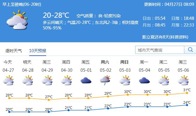 見圳客戶端?深圳新聞網(wǎng)2020年4月27日訊 27日我市多云間晴天,部分時(shí)間有輕微-輕度灰霾;氣溫20-28℃;東北風(fēng)2-3級(jí);相對(duì)濕度50%-95%。未來幾天陽(yáng)光增多,氣溫回升,溫暖干燥;5月1-3日多云間陰天,早晚有輕霧,間中有分散陣雨。
