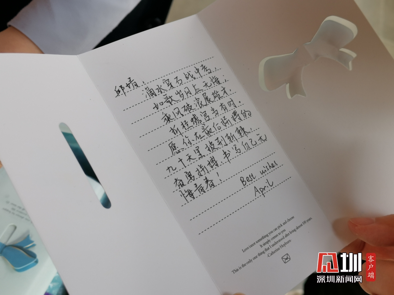 “滴水穿石戰(zhàn)中考,如歌歲月應(yīng)無悔。乘風(fēng)破浪展雄才,折桂蟾宮當(dāng)有時(shí)。愿你在最后拼搏的九十天里,披荊斬棘,奮勇拼搏,書寫自己無悔青春?!边@是龍華區(qū)外國(guó)語學(xué)校邱婧同學(xué)收到的老師親筆手寫的激勵(lì)卡,這些充滿力量的鼓舞詞句表達(dá)了畢業(yè)班園丁們對(duì)學(xué)生們的共同祝福與期盼。