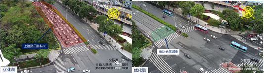 針對(duì)這一現(xiàn)象,深圳交警將東向一條直行車道改為左轉(zhuǎn)車道,并根據(jù)實(shí)際流量提高了東方向左轉(zhuǎn)綠燈時(shí)長(zhǎng)。優(yōu)化后路口排隊(duì)現(xiàn)象得到緩解路口總平均排隊(duì)長(zhǎng)度由310米下降至168米,降幅45.80%。