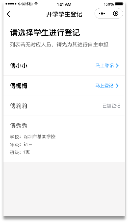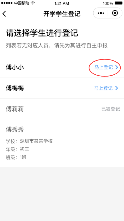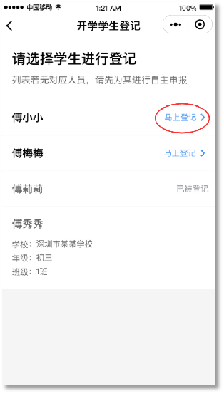 ③完成后進(jìn)入“開(kāi)學(xué)學(xué)生登記”頁(yè)面,選擇學(xué)生名字旁邊的“馬上登記”,填寫(xiě)班主任姓名和手機(jī)號(hào)碼后點(diǎn)擊“下一步”。