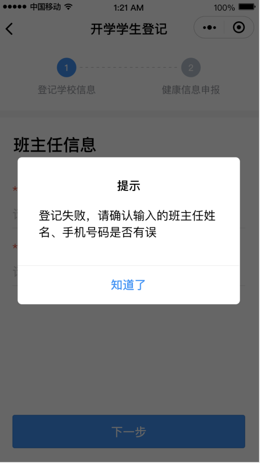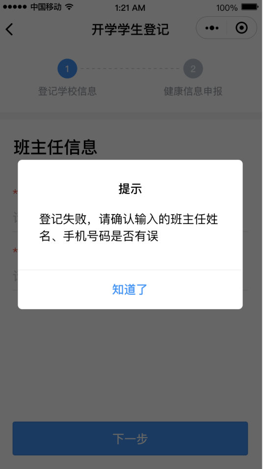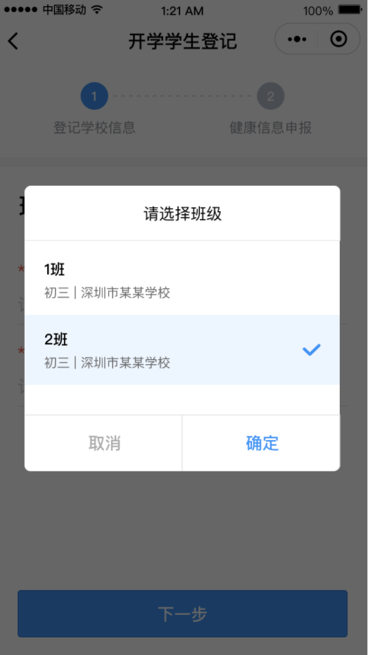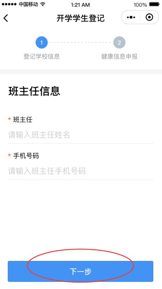 ②進(jìn)入“學(xué)生登記”頁(yè)面,點(diǎn)擊“馬上登記”按鈕,填寫(xiě)班主任姓名和手機(jī)號(hào)碼后點(diǎn)擊“下一步”,然后選擇對(duì)應(yīng)的班級(jí),進(jìn)入健康申報(bào)卡界面。
